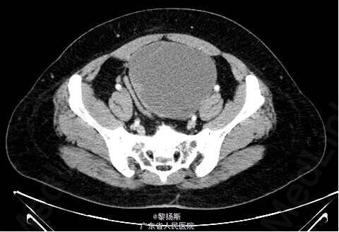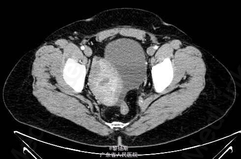 女性,42岁,”发现盆腔包块2年”,无腹痛,无异常阴道流血;自述10年前曾因“盆腔炎” 在外院手术治疗,切除一侧附件,具体不详,有子宫肌瘤病史。