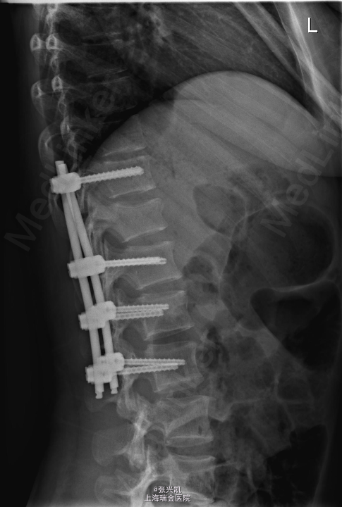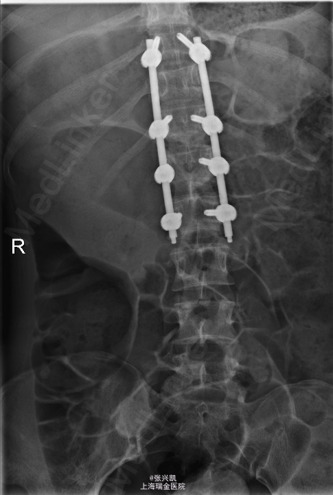 随访:术后三月复诊,内固定装置位置良好,患者腰背痛症状缓解,一年后骨折愈合,行内固定装置取出。术后患者腰部活动良好 讨论:术后应积极锻炼腰背部肌肉,防止萎缩。