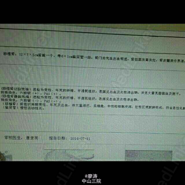 随访:患者切除移植肾后全身抗感染治疗,效果良好,2周后出院。于2014-12-30在我院行二次肾移植术,二次肾移植术后病情也很复杂,苦难多,现在问题都已解决,二次肾移植术后移植肾功能良好。 讨论:现在器官来源主要是DCD(公民心死亡后捐献),在全身器官衰竭后感染可能性增大,用这种器官必然增加受者感染的风险,这种大出血如果发生的急促的话很容易死亡。该病人以后我们在术后加强了预防感染措施,效果良好。