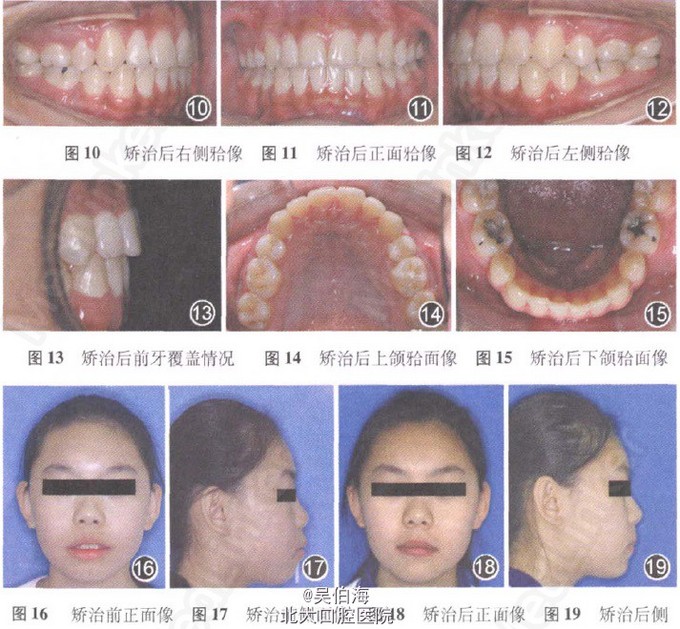总疗程19个月,上下牙列排列整齐,前牙覆殆覆盖正常,中线居中对齐,磨牙关系中性,后牙尖窝关系良好。矫治前后相比,患者侧貌改善明显。 (本病例摘自:陈莉莉,Tip-Edge Plus直丝弓技术矫治Ⅱ类错(牙合)的临床应用初探,中华口腔正畸学)