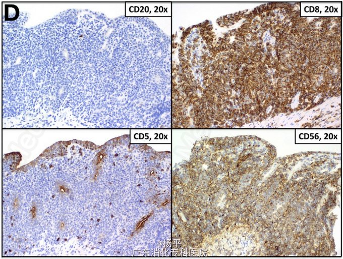 急性起病及血清学检查阴性并不符合乳糜泄特点,因此应怀疑胃肠道淋巴组织增生性疾病。免疫组化染色证实了细胞毒性 T 细胞 /NK 细胞性免疫表型(CD20-,CD3+,CD8+,CD56+,TIA-1+)伴 CD5 的异常减少(图 D),因此考虑该患者的诊断为Ⅱ型 肠病相关性 T 细胞淋巴瘤(EATL)。 此例患者疾病发生后迅速出现高度肠道梗阻,且迅速出现败血症、多器官功能衰竭,最终死亡。