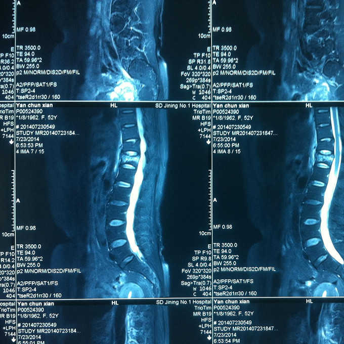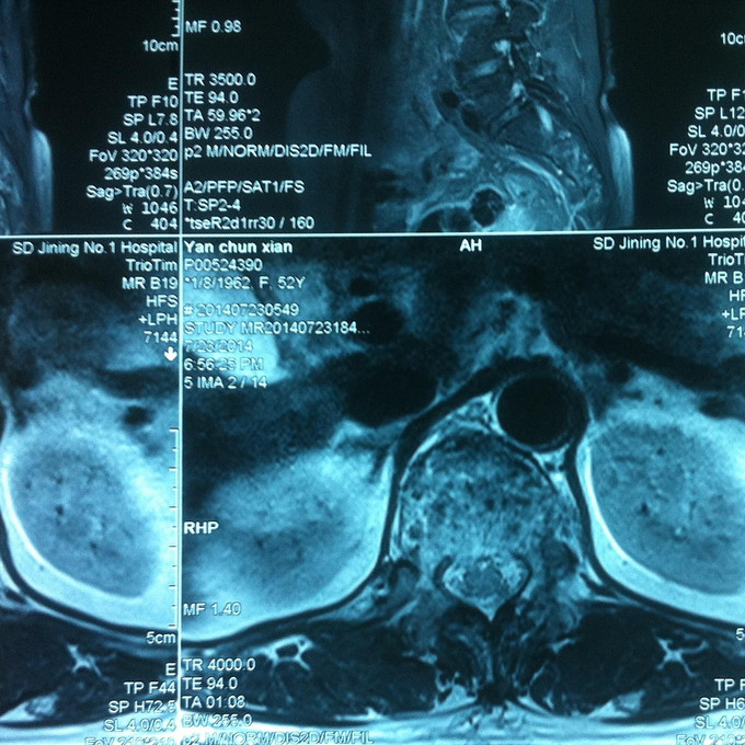 查体:腰部叩痛,腰部活动受限,双下肢感觉无异常,双侧屈髋、伸膝、踝背伸、踇背伸、跖屈肌肌力4-5级,双侧膝腱反射++,跟腱反射+,双侧巴氏征阴性, 影像学检查MR:腰椎骨折,累及中柱。