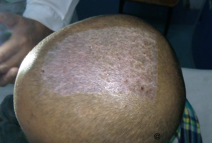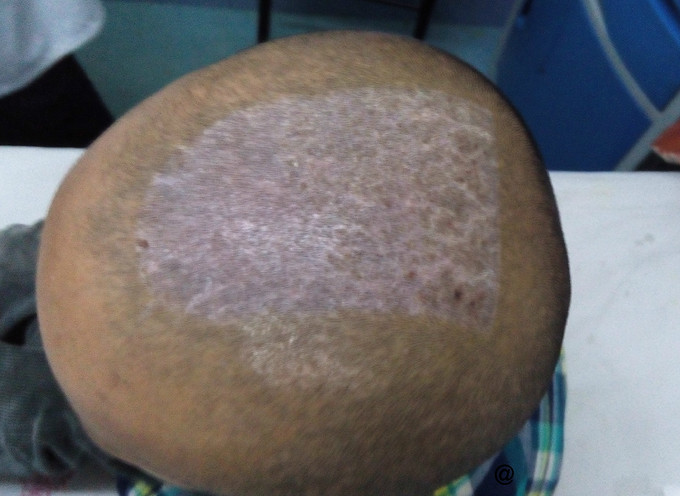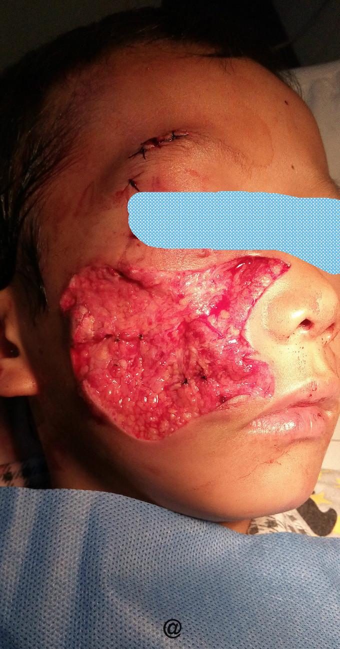 诊断: 狗咬伤:右侧面部皮肤撕裂伤、皮肤缺损、右侧眉弓撕裂伤 治疗: 1、局麻下为患者行“右侧面部皮肤撕裂伤清创缝合术”,缝扎右侧面动脉小分支活动性出血血管,用稀释碘伏液、双氧水及生理盐水反复冲洗创面, 2、急请美容外科会诊,协助查看患者病情。因基底部挫伤重,可能部分组织会发生坏死,手术会导致重要解剖组织进步一步外露,建议等创面生长一段时间后再行植皮手术。后用碘伏油纱湿敷创面。 3、联系市疾控中心紧急为患者注射狂犬病疫苗及狂犬病免疫球蛋白,防止发生狂犬病毒感染。 4、破伤风抗毒素皮下注射。 6、补液,头孢菌素积极预防感染。 7、5日后在美容科协助下全麻为患者进行“右颜面部创面扩创植皮术+头部取皮术”,首先在头皮下注射生理盐水近500ml,用电动取皮机取刃厚皮片约1%,用碘伏油纱湿敷取皮区,戴弹力头套,压迫48小时后暴露; 创面扩创修整,将头皮移植于右面颊部创面,3-5天换药 8、术后5日查见取皮区愈合良好,毛发生长正常。右颜面部皮片生长尚可。 术后一周患者出院