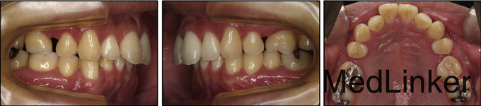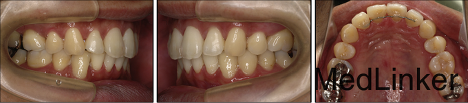 凸面型,骨性II类,青少年期拔除了3颗前磨牙但由于其他原因未继续矫正,深覆合,覆盖5.5mm,右侧磨牙I类,左侧磨牙II类关系,双侧尖牙II类