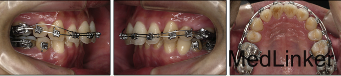 诊断:骨性II类,安氏II类,牙列间隙 治疗:上颌先上.022直丝拖槽,14niti排齐整平,依次换丝,为打开前牙咬合,16*22TMA弯制压低辅弓,如图。打开咬合后,粘接下颌拖槽,继续矫正。
