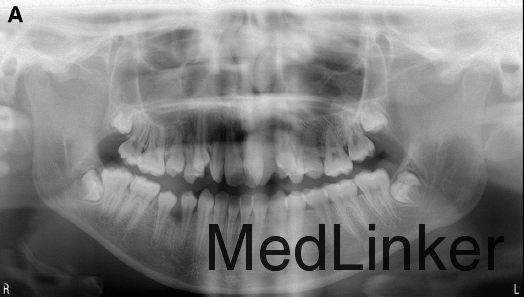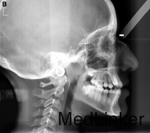 直面型,上颌严重横向不调伴严重拥挤(拥挤度17mm),前牙及双侧后牙反合,下牙列重度拥挤,左侧磨牙I类,右侧磨牙II类关系,双侧尖牙II类关系。劲椎片可见其已过生长发育期