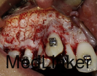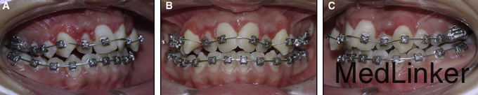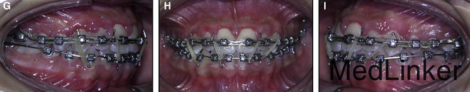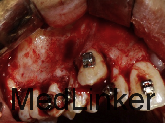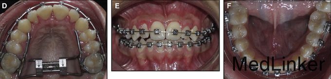 诊断:上牙弓严重横向不调。治疗:上颌颊侧骨皮质切开术+固定矫治+上颌腭侧固定扩弓。上颌上拖槽一周后行骨皮质切开术,如图,切开后全层翻瓣暴露骨皮质,于骨皮质上打孔,范围从牙槽骨顶端下方2mm到根尖下方2mm。根据牙槽厚度孔的深度从0.5mm到1.5mm不等,复位后间断缝合。同时腭侧粘接由带环,螺旋扩弓器制作的固定扩弓装置,即刻加力,转动完整的一圈。之后每周扩弓器打开1mm,连续8周,上颌牙弓被打开,扩弓器再维持2月,同时固定矫治器继续排齐整平。总疗程5个月2周。上颌宽度变化第一前磨牙间增加10mm,第二前磨牙间增加8.9mm,第一磨牙间增加8.3mm。但尖牙间宽度不变,这也是为什么扩弓后后期牙弓能够保持的原因,尖牙间宽度对维持牙弓稳定性非常重要。