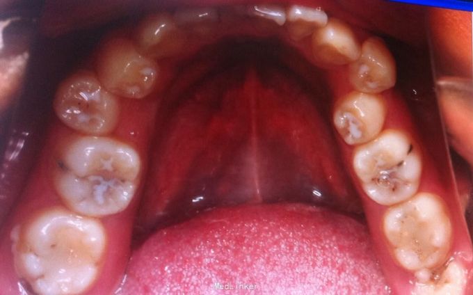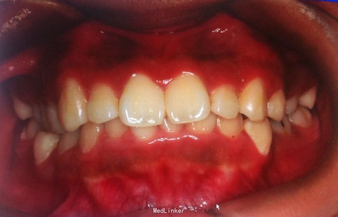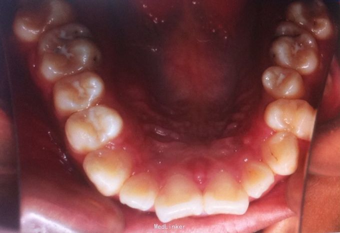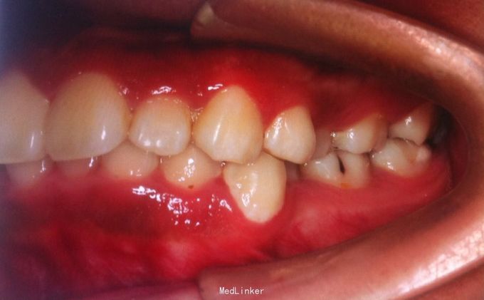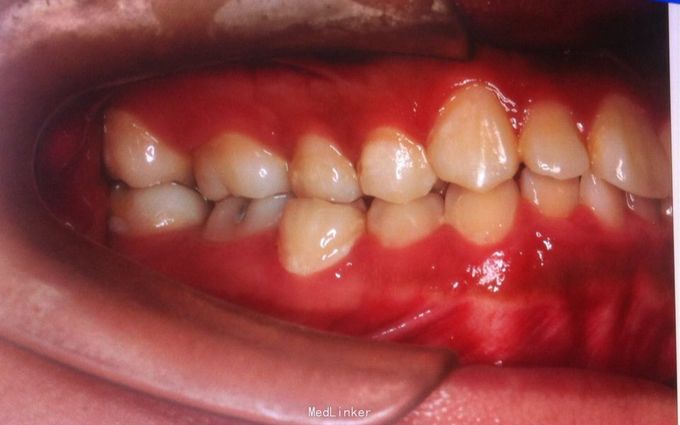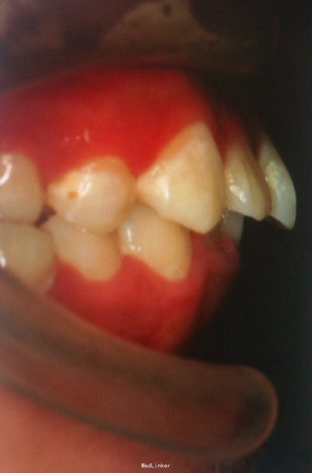 恒牙期 左侧磨牙中性关系,右侧远中关系 前牙三度深覆合 上合牙列中度拥挤,下颌重度拥挤 下颌中线偏右 关节有弹响