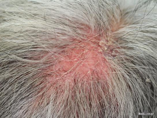 患者为 82 岁性日本妇女,2012 年 9 月就诊,6 年前起出现枕部脂溢性斑红斑,境界不清,无不适。患者曾外用糖皮质激素,诊断脂溢性皮炎后应用抗真菌药物,治疗无好转。