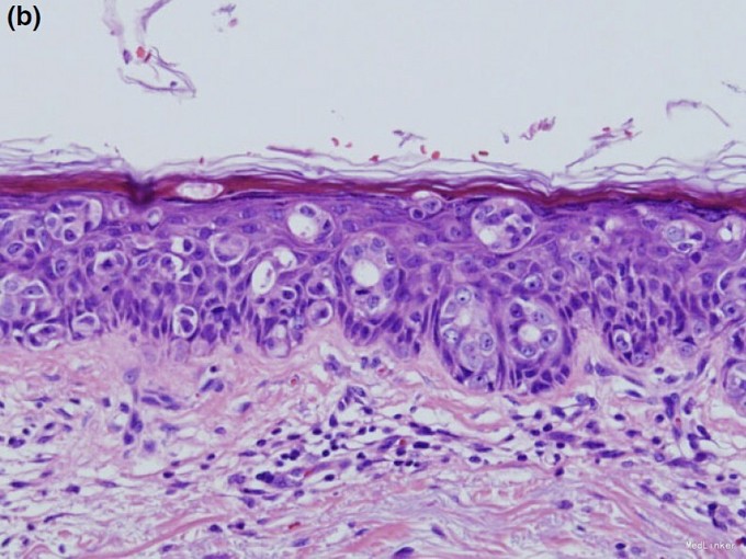EMPD 分为原发性及继发性两类,后者由内脏恶性肿瘤直接扩散所致,如直肠癌及肛门癌。异位性 EMPD 是发生于无顶泌汗腺部位的疾病,除了肛周、生殖器及腋窝外,其他部位 EMPD 仅有 30 例报道。 头部异位性 EMPD 的 Paget 细胞可能起源于胚胎生殖细胞。EMPD 组织病理学诊断应与其他细胞胞浆透明的斑疹性表皮恶性肿瘤鉴别,如浅表扩散性黑素瘤及恶性雀斑样痣,后两者的表皮标志阴性,而黑素细胞标志(S-100 蛋白、Melan A 及 HMB-45 等)阳性。另外,p63 基因可用于鉴别鲍恩病 paget 样变型。 DOI: 10.1111/ijd.13018