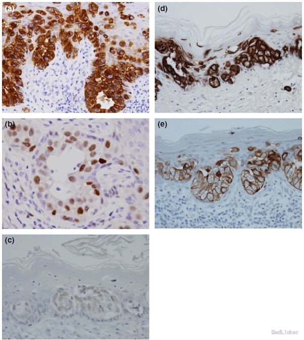 查体:枕部红斑,边界欠清,部分脱色性鳞屑性斑片中见轻度脱发(图 1)。余部位皮肤及浅表淋巴结未见异常。既往史及家族史无特殊。 辅查:皮损中部活检后组织病理:表皮内大量散在或成巢的大细胞,细胞质透明,核非典型。这些非典型细胞部分浸润于附件,而无真皮受累(图 2a)。部分细胞成管状细胞巢,部分管状结构内层细胞可见断头分泌至管腔(图 2b)。 非典型细胞免疫组化:过碘酸 - 希夫染色、阿辛蓝染色、癌胚抗原、雌激素受体、雄激素受体、细胞角蛋白 -7、细胞角蛋白 -20、囊泡病液体蛋白 -15 阳性(图 3a-e),AE 1/3 阳性;p63、黄体酮受体、S-100 蛋白及 HMB-45 阴性。腹部超声、CT、胸片及 PET-CT 等检查未见其他异常。