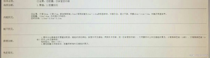 查体:T:36.8℃,P:75次/分,R:20次/分,BP:120/80mmHg。神志清楚,查体合作,面容正常,全身浅表淋巴结无肿大。心胸肺无特殊。双下肢无水肿。生理反射存在,病理反射未引出。 专科情况:腹部外形正常,全腹柔软,未及包块,上腹部剑突下压痛,肠鸣音活跃,肝脾肋下未触及。 辅助检查:2015-11-9日在同济医院就诊胃镜检查示贲门巨大溃疡,活检示腺癌。本院检查见下图。