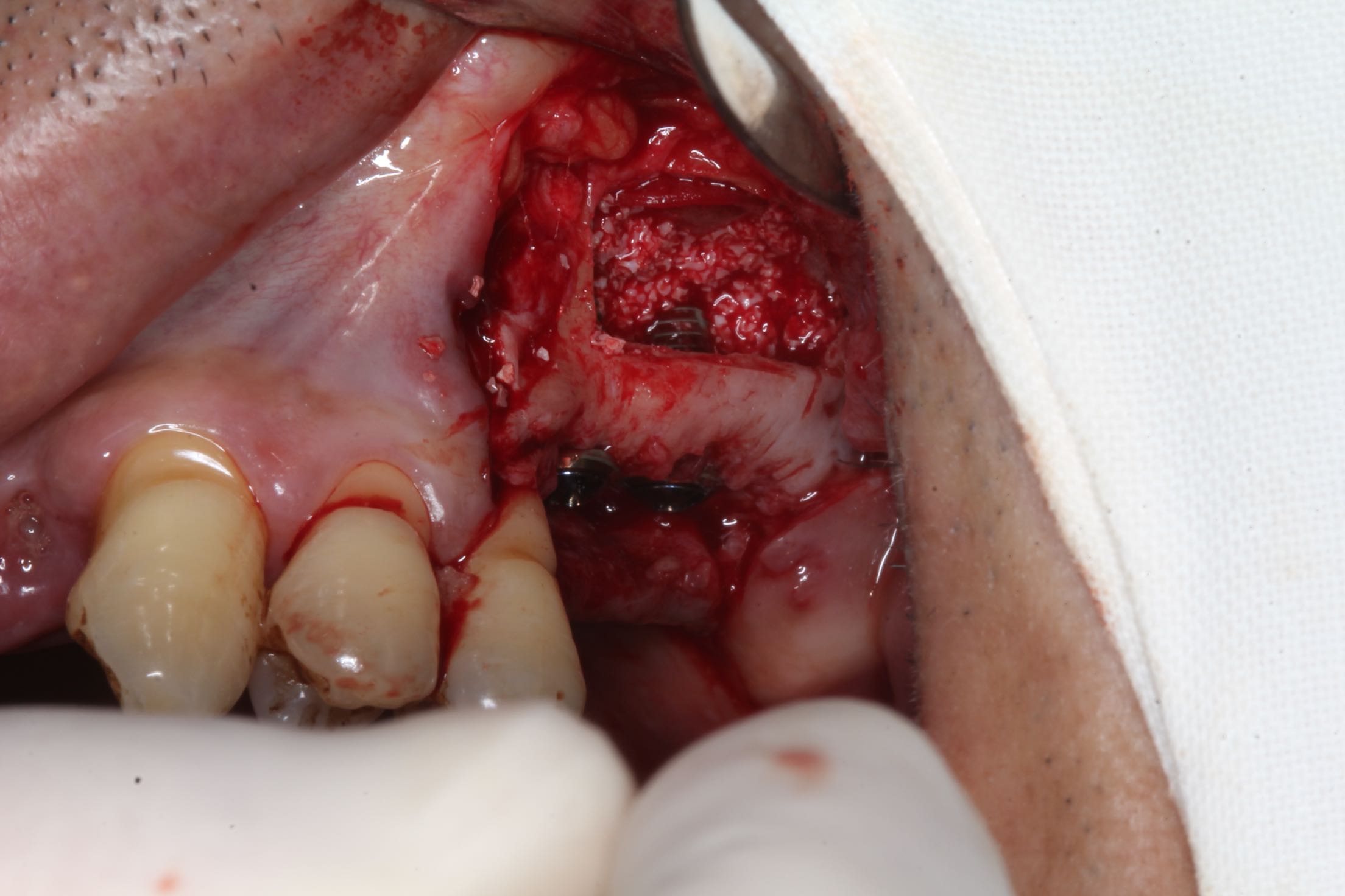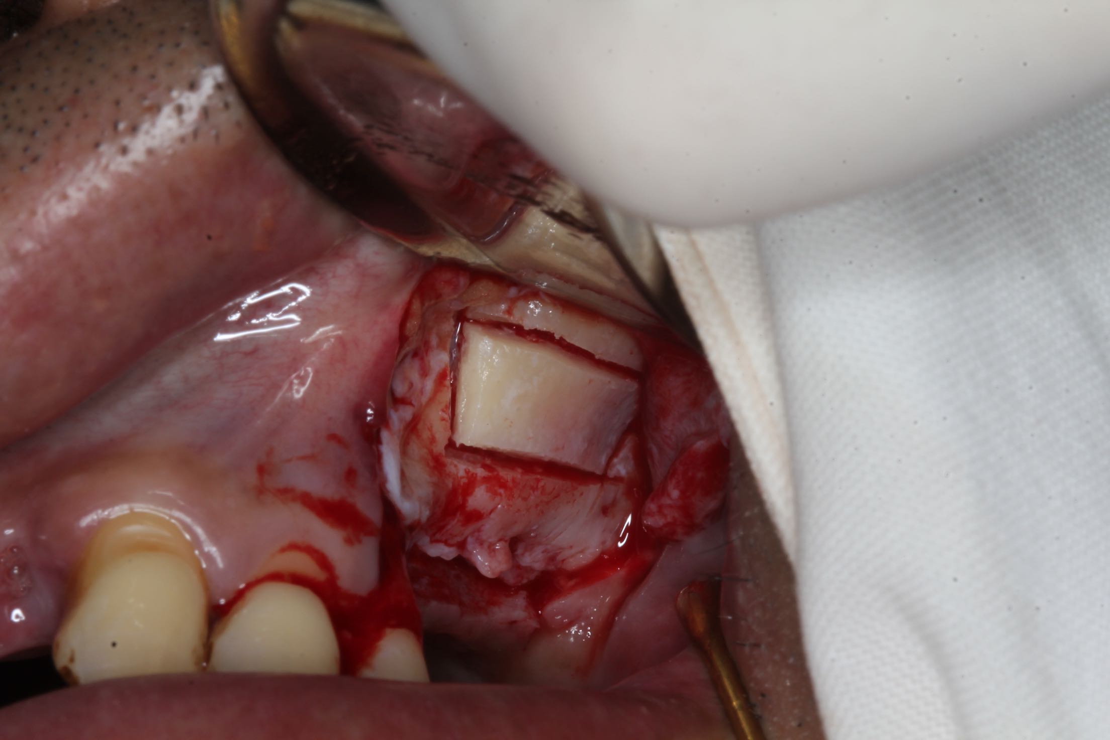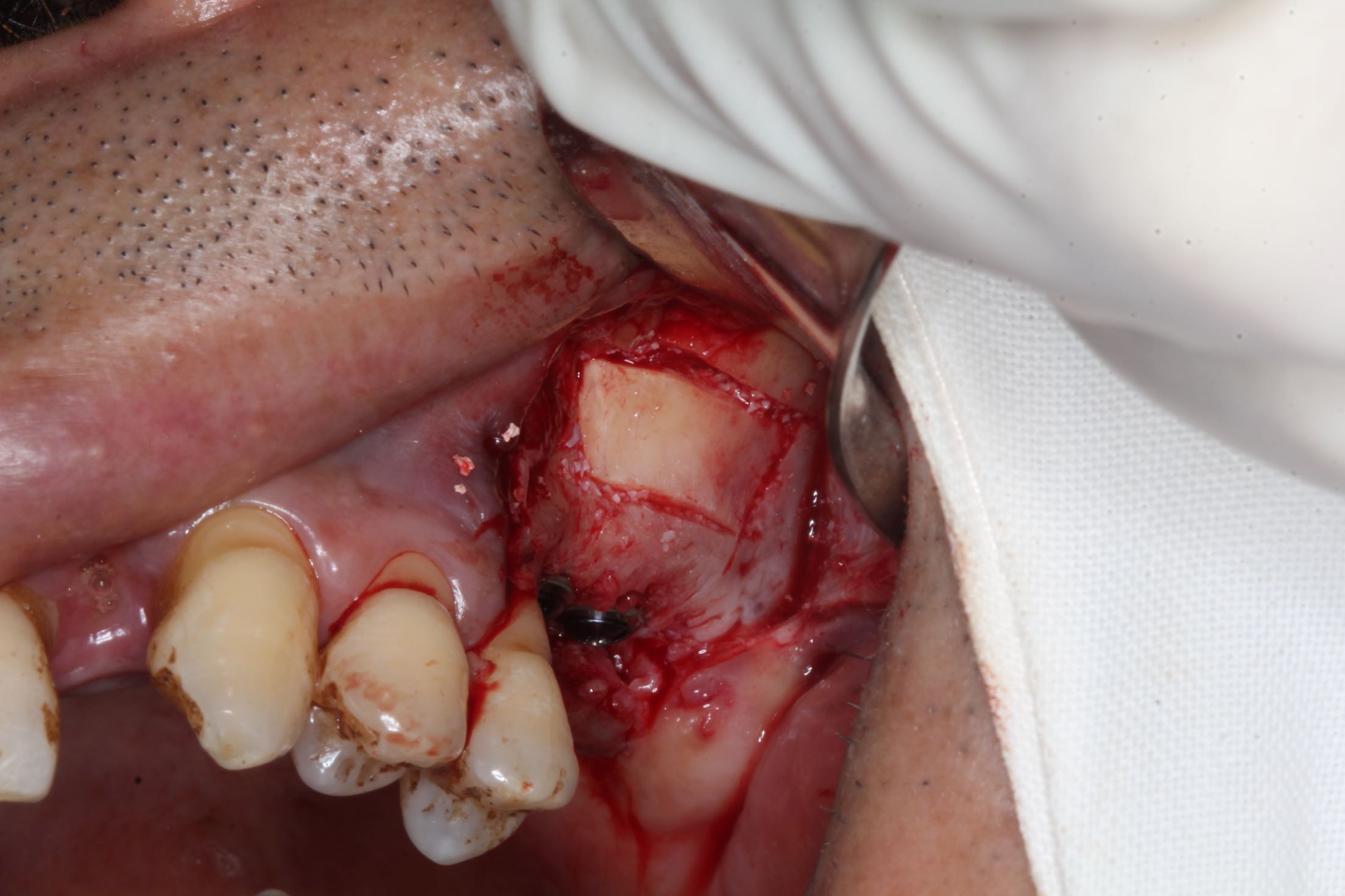 26、27缺失,牙槽骨严重吸收。 治疗:上颌窦外侧壁超刀开窗,取出外侧壁骨块,剥离黏膜,考虑严重吸烟史,黏膜菲薄,垫上一层胶原膜,植入部分Bio-ss骨粉,牙槽嵴顶备洞,26牙植入dentium4.3-10,27牙植入4.3-8,继续植入骨粉共0.5g,开窗处复原骨块,严密缝合!26牙植入扭力35牛,27植入扭力15牛!嘱尽量戒烟,