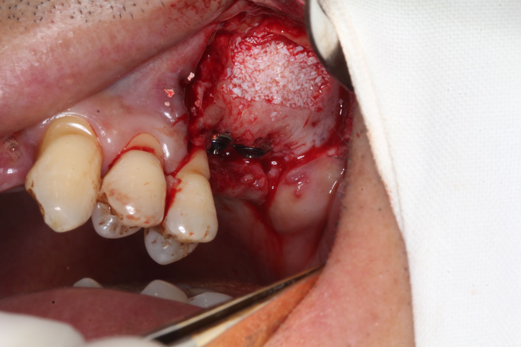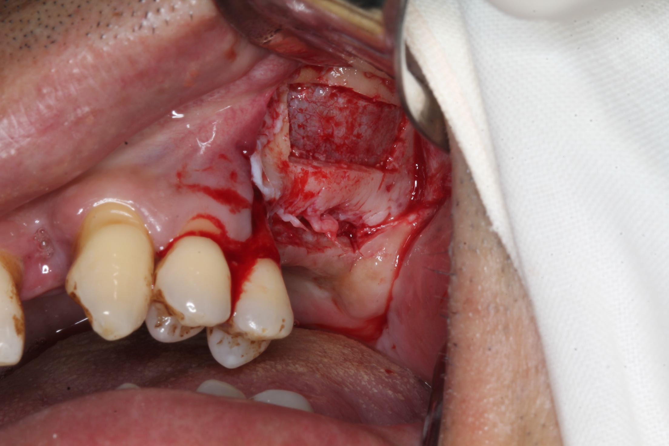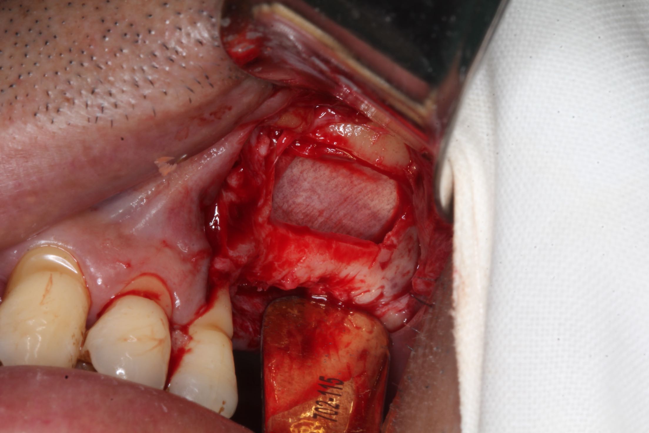 26、27缺失,牙槽骨严重吸收。 治疗:上颌窦外侧壁超刀开窗,取出外侧壁骨块,剥离黏膜,考虑严重吸烟史,黏膜菲薄,垫上一层胶原膜,植入部分Bio-ss骨粉,牙槽嵴顶备洞,26牙植入dentium4.3-10,27牙植入4.3-8,继续植入骨粉共0.5g,开窗处复原骨块,严密缝合!26牙植入扭力35牛,27植入扭力15牛!嘱尽量戒烟,