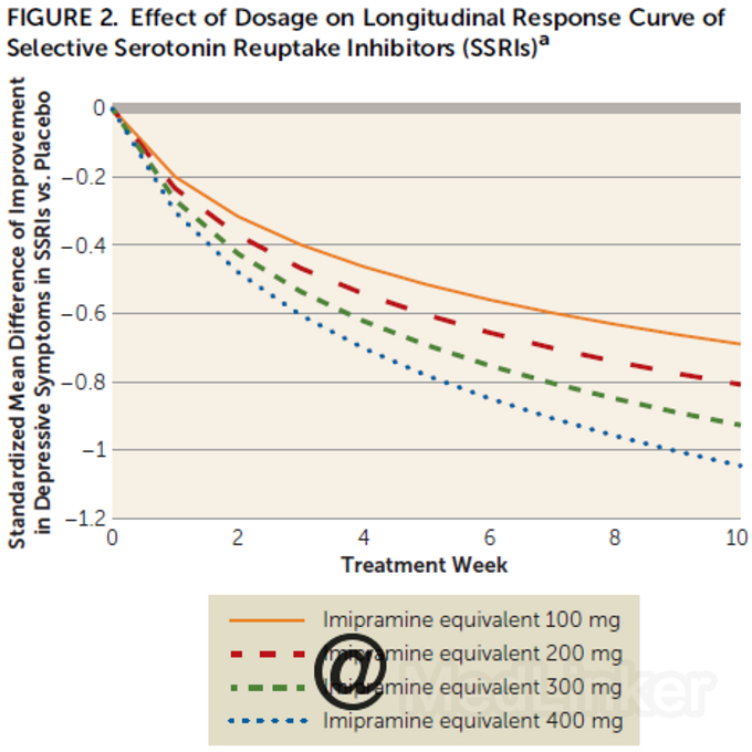改研究检索了PubMed中评估SSRIs治疗成人抑郁症疗效的随机安慰剂对照试验,研究者收集了这些研究中有关治疗应答及全因/不良反应所致治疗中断的数据,所有药物的剂量均转换为等效丙咪嗪剂量。