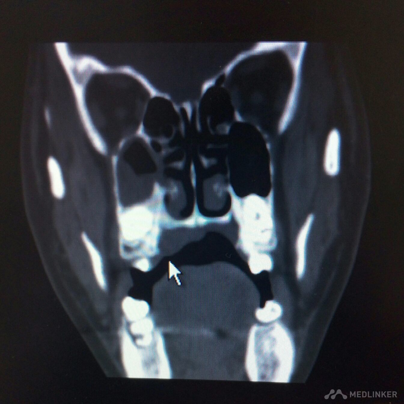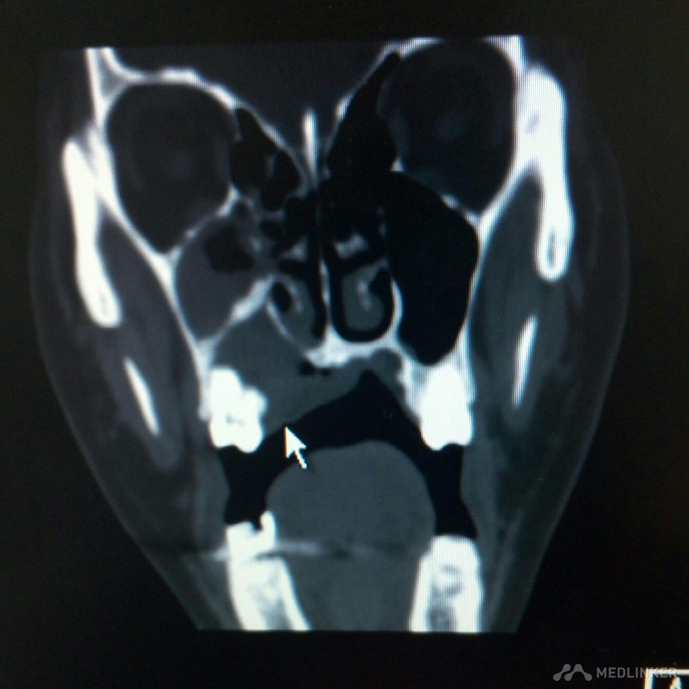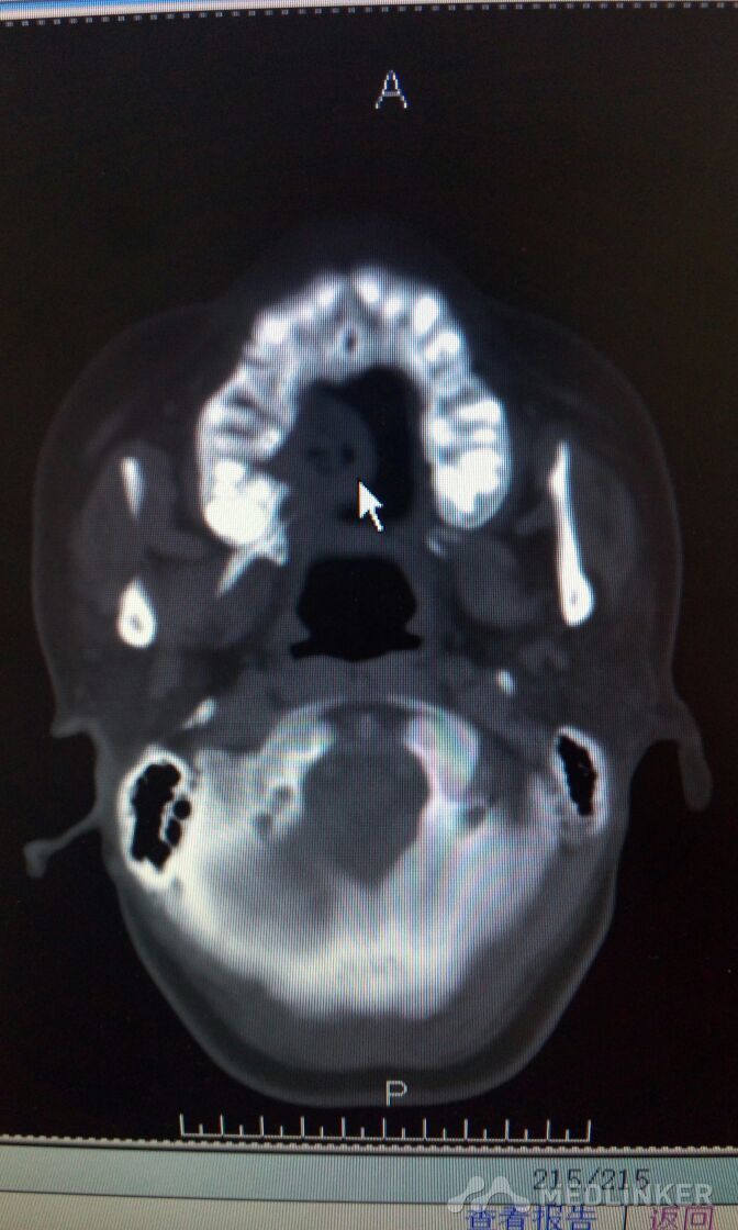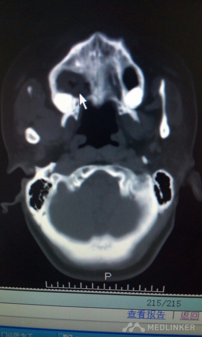 患者,女,38岁。因“发现右侧腭部肿痛一周”,来诊。查体:颌面部对称,张口度好。腭部右侧可见粘膜凸起肿物,约2*3cm,近中线处溃烂,有溢脓。CT检查可见肿物突入上颌窦及鼻腔,骨质破坏。现应用抗菌素治疗。拟行病理活检。请同仁看看手术方案?患者年轻,一侧上颌骨去除,假体如何修复?可否请鼻科联合手术,保留颌骨?
