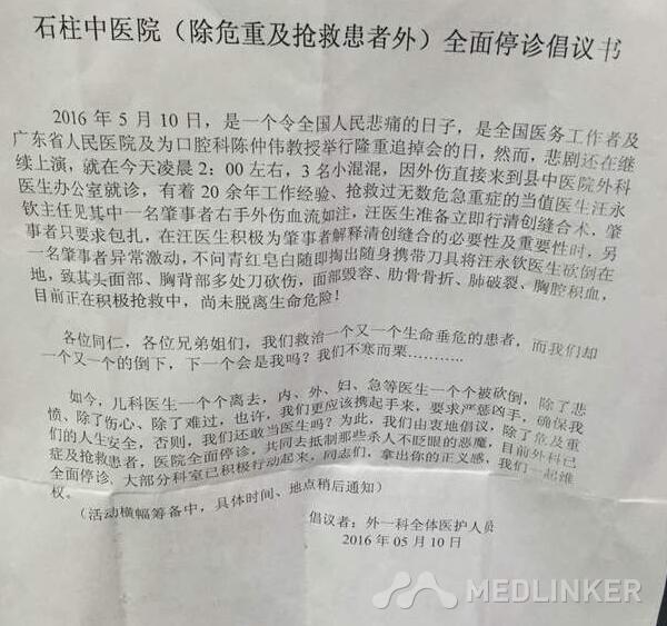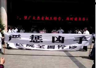目前石柱县中医院外科全体医护人员发出了全面停诊倡议书,医院除危急重症和抢救患者外科已经全面停诊,在中医院大门前拉横幅,发出严惩凶手的抗议!