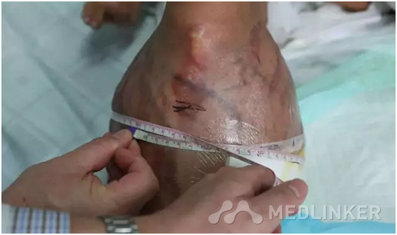 3月28日,副院长穆锋博士把我领到三区319房看望艾琳。当时的她头上无一丝头发(化疗引起),面色晃白,肋间隙深陷,腹部状如小舟。右腿瘦如枯枝,周径5.5厘米,而用纱布裹着的左小腿粗如水桶,包裹的纱布下,从小腿后面长出一椭圆形瘤子,周径61.5厘米,用双手丈量不能合拢,表面皮肤紫暗,部分皮肤溃烂。再看CT片,图像显示小腿部有一巨大瘤块。马来西亚的医院做活检显示恶性梭形细胞瘤。我建议复查CT和MR,了解血管情况,同时积极改善全身营养状态。