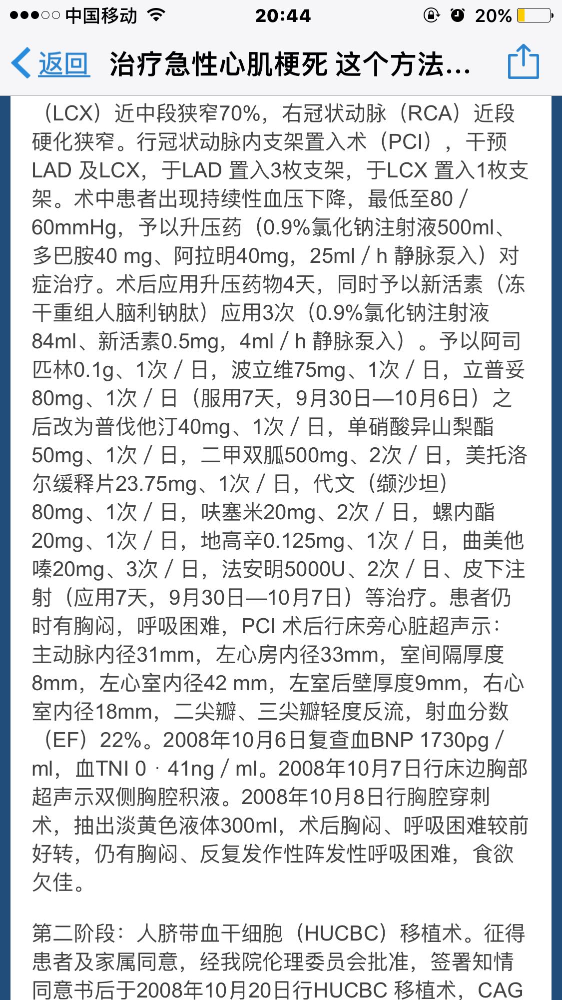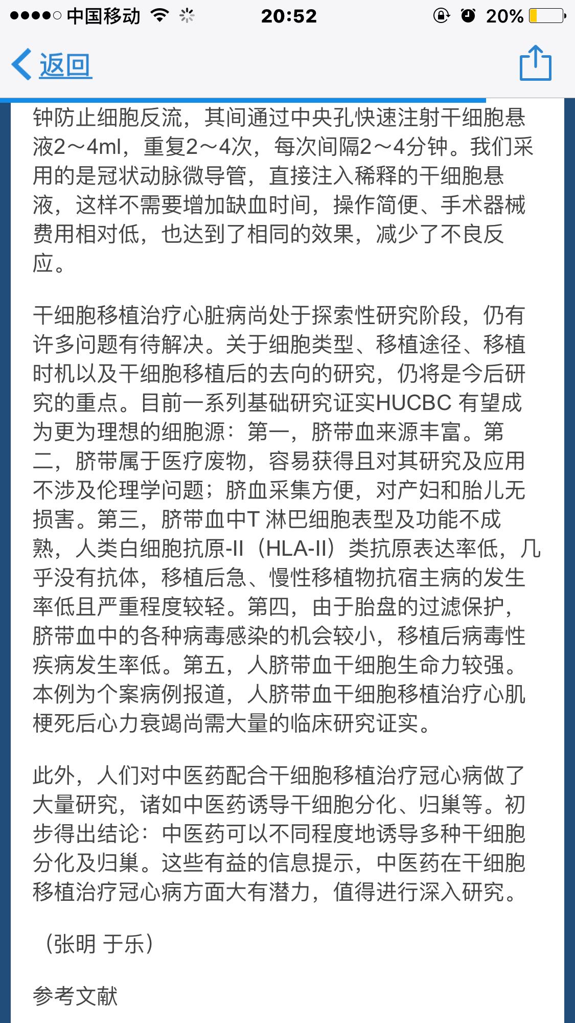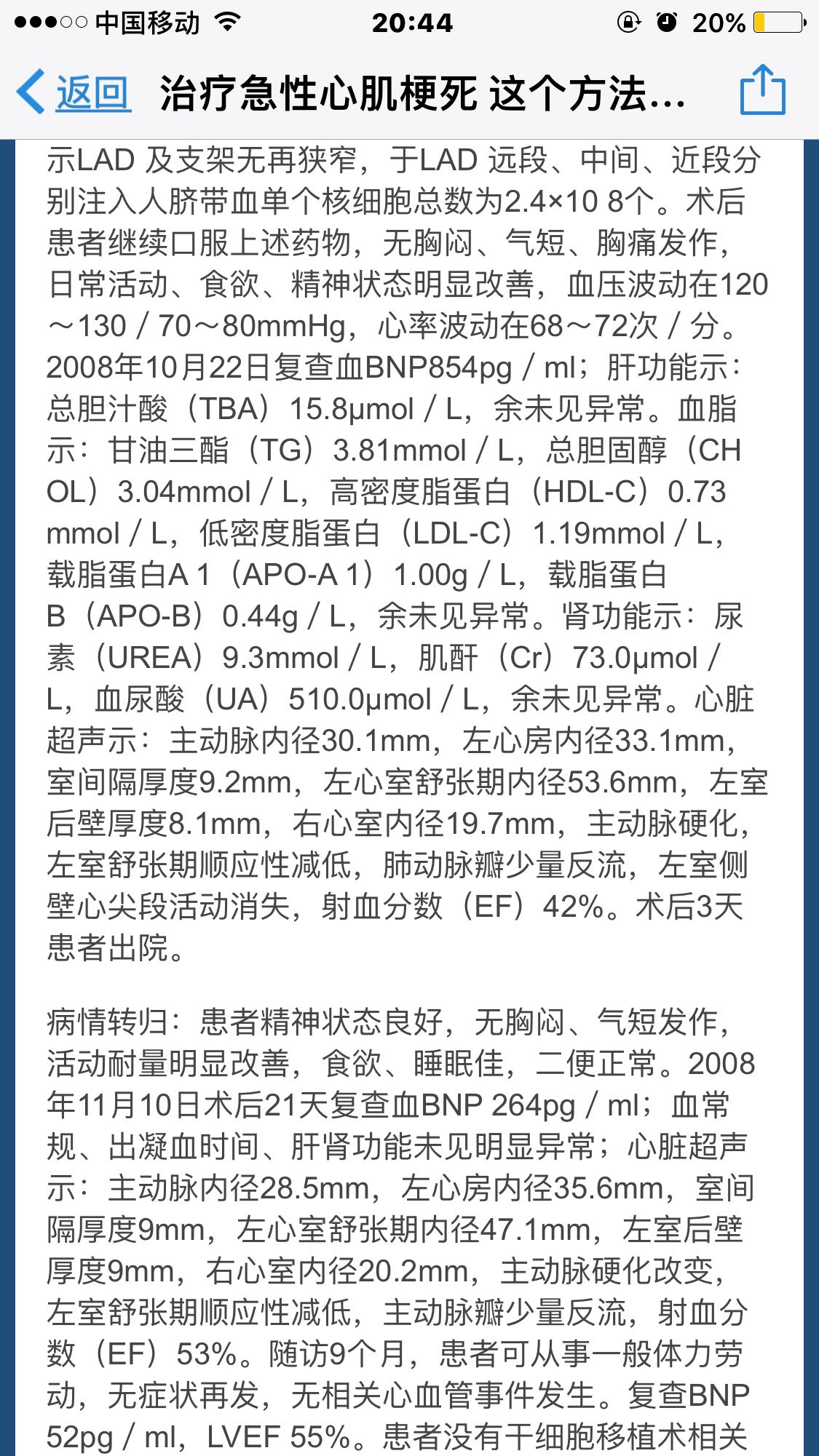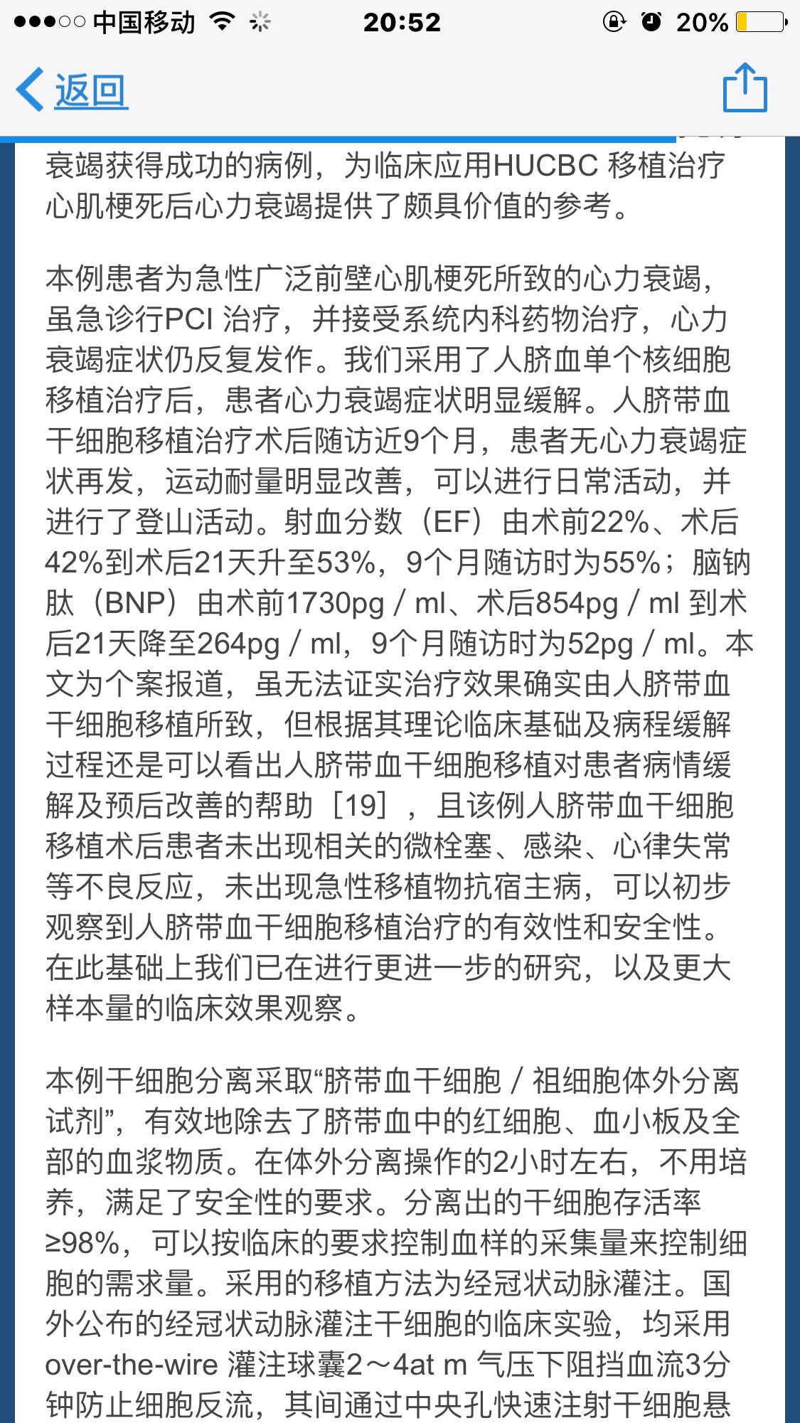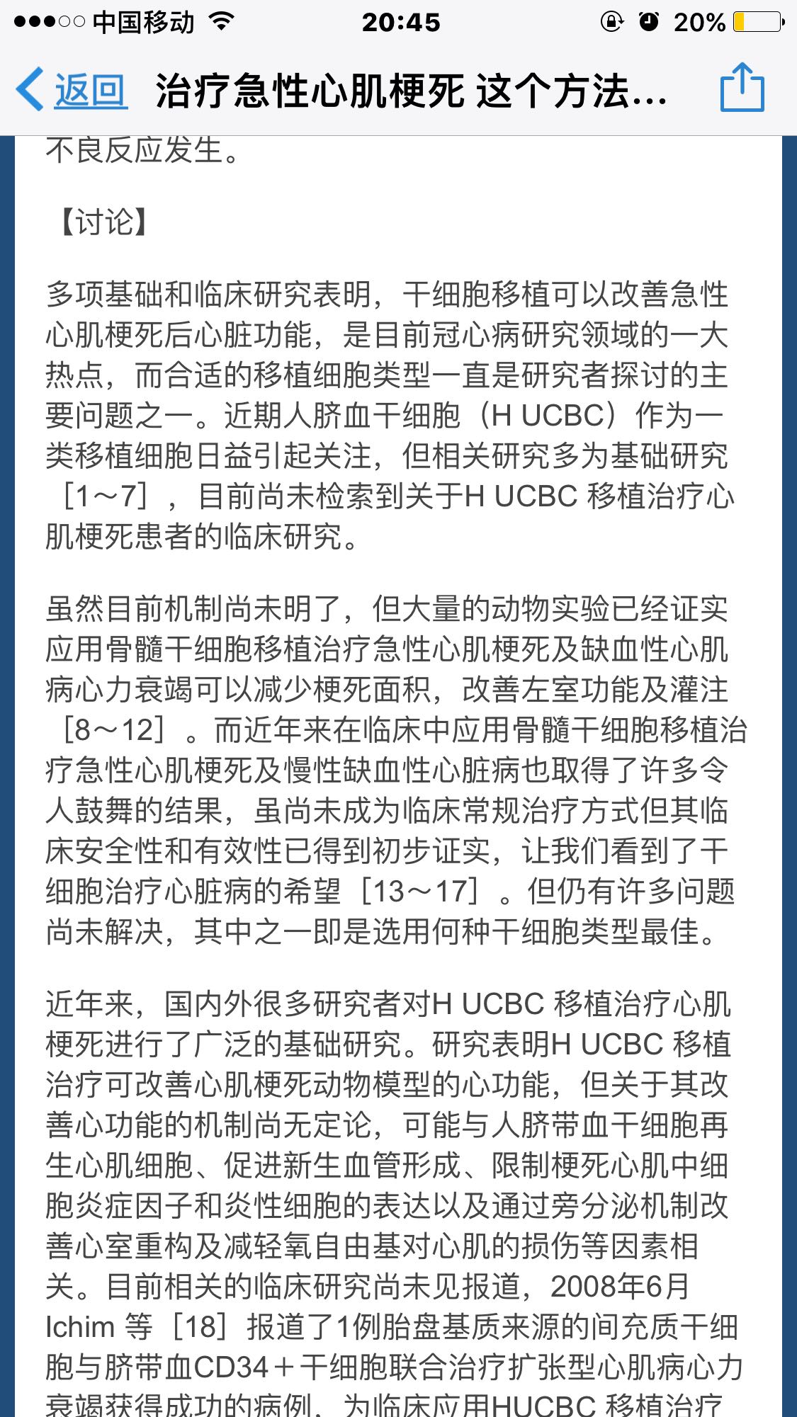 最近看资料,发现一种高大上的非常特别有趣的治疗方案:人脐带血干细胞移植(HUCBC)治疗急性心肌梗塞后的心衰,改善心功能。我是第一次听说(孤陋寡闻,才疏学浅汗颜😓)。忍不住与各位同仁分享探讨,首先声明一下:如有侵权请告知我删帖。详情请看下图: