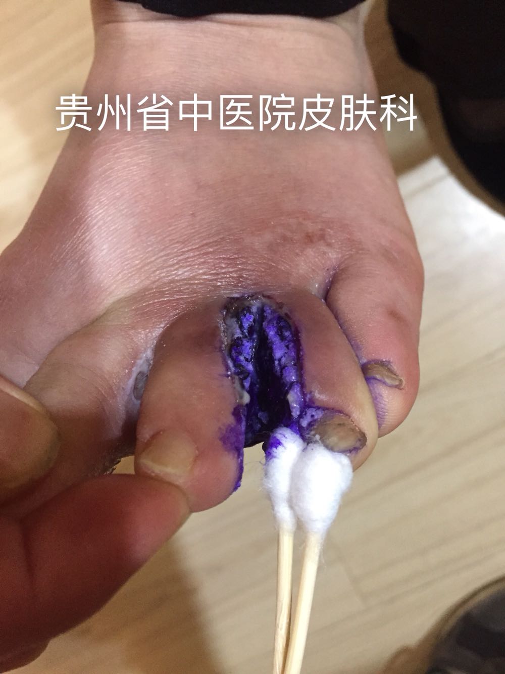 足癣引起的溃疡 浸渍糜烂型:表现为局部角质层浸软发白。由于走动时不断摩擦表皮脱落,露出鲜红色糜烂面;严重者趾缝间、趾腹与足底交界处皮肤均可累及,瘙痒剧烈,多发于第3、4、5趾缝间。 1924112477