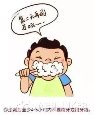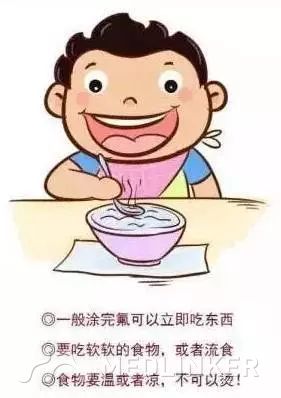 一般涂完氟后孩子就可以立即吃东西(但一般来说,牙医会建议半小时内不要进食,如果要进食,也请注意要给孩子较软的食物或者流食,温度要凉或者温,不要吃太热的食物)。 至少4-6小时内不要刷牙或用牙线;一般医生会建议第二天再刷牙。 刷牙时要提醒孩子吐掉嘴里的漱口水,不要吞掉。