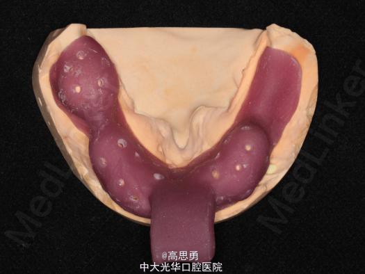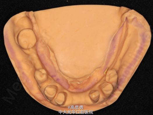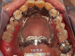 6、试排牙 检查义齿的就位、固位可,无翘动,观察人工牙的咬合状况,尖窝接触良好,正中颌位能重复,患者无诉不适,面容自然,外观满意。送加工厂充胶制作最终修复体。