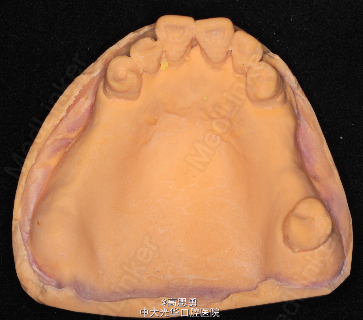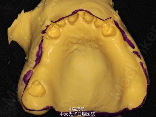 2、研究模型 调拌藻酸盐印模材料于2号成品托盘上取上下颌研究模,灌注石膏模型,研究分析、制定治疗计划,并制作个别托盘。