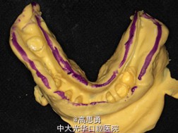 7、试戴 检查义齿的就位、固位可,无翘动,咬合关系正确,利用咬合纸检查,上下颌尖窝接触均匀全面,抛光,患者表示满意,嘱注意事项,定期复诊。