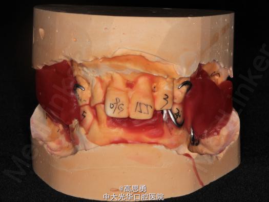 5、试戴支架 检查支架的就位、固位可,无翘动,调HE,抛光,用蜡堤取颌位关系,上颌架,排牙,比色C4。