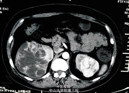 腹部超声:右肾混合性占位性病变(中下极见一个大小约90*65*83mm的混合回声团,边界尚清,内回声不均,可见密集分布的无回声囊,呈蜂窝状);右肾局限性积液;胰腺内异常回声(多个大小不等的无回声囊,大者约12*11mm,边界清);双侧卵巢小囊(27*25mm(右)、25*25mm(左));肝、胆、脾未见明显异常;左肾、膀胱未见明显异常;双侧输尿管未见明显扩张;子宫未见明显异常。腹部增强CT ,胰腺多发囊性病变,右肾巨大占位,考虑肾癌。