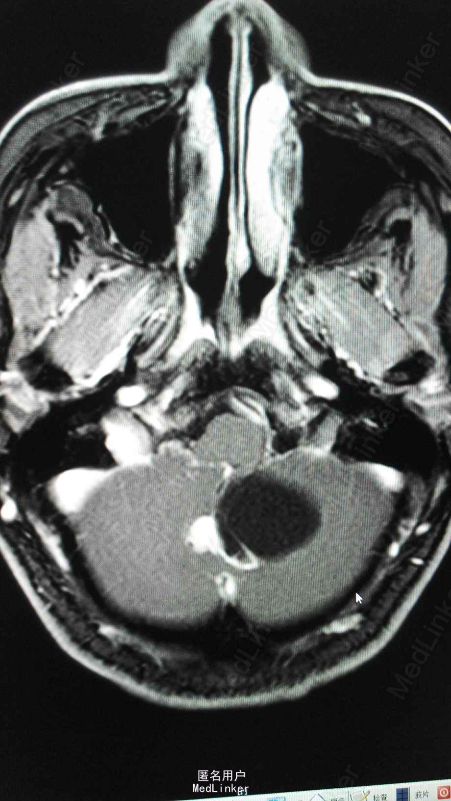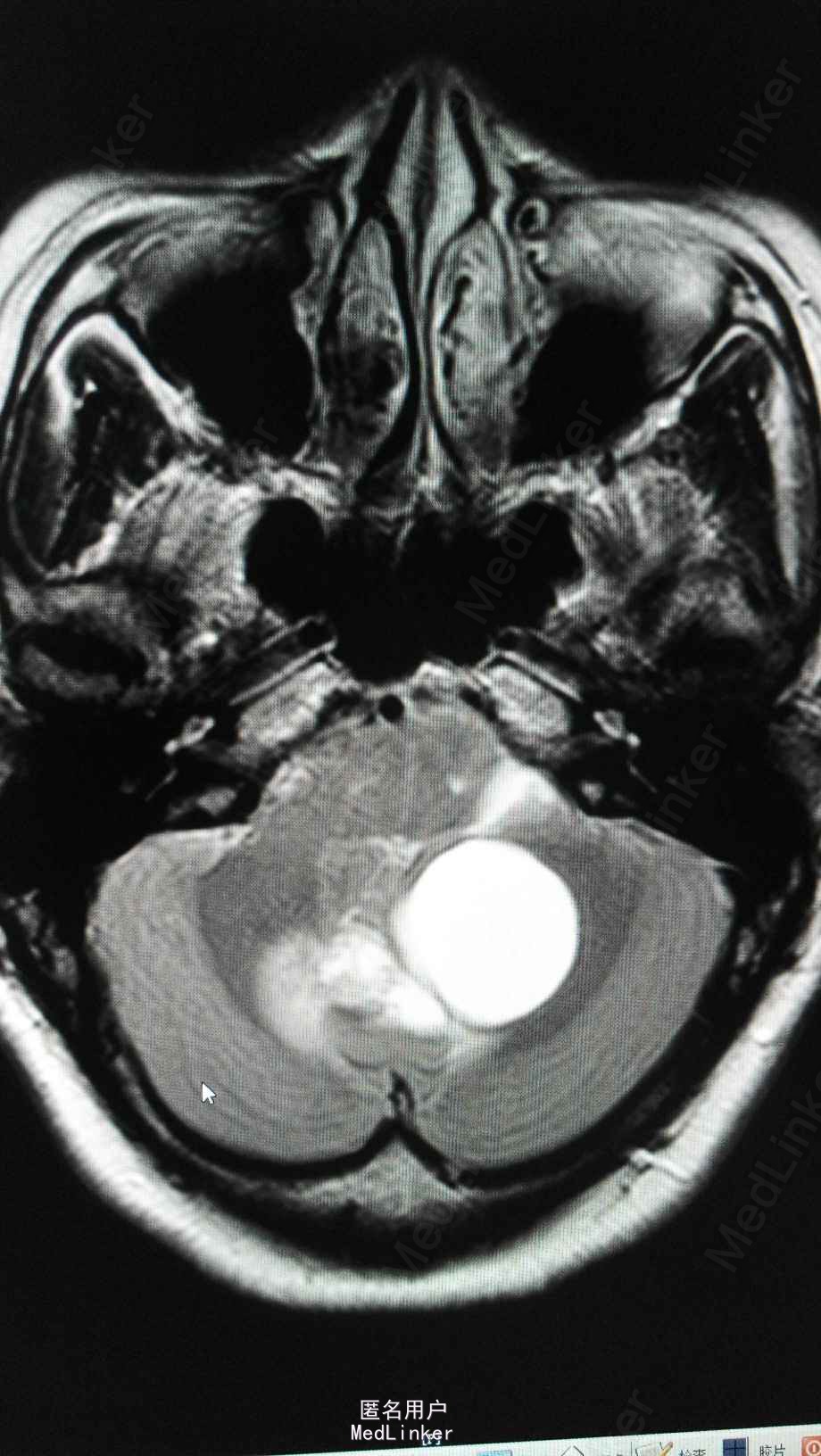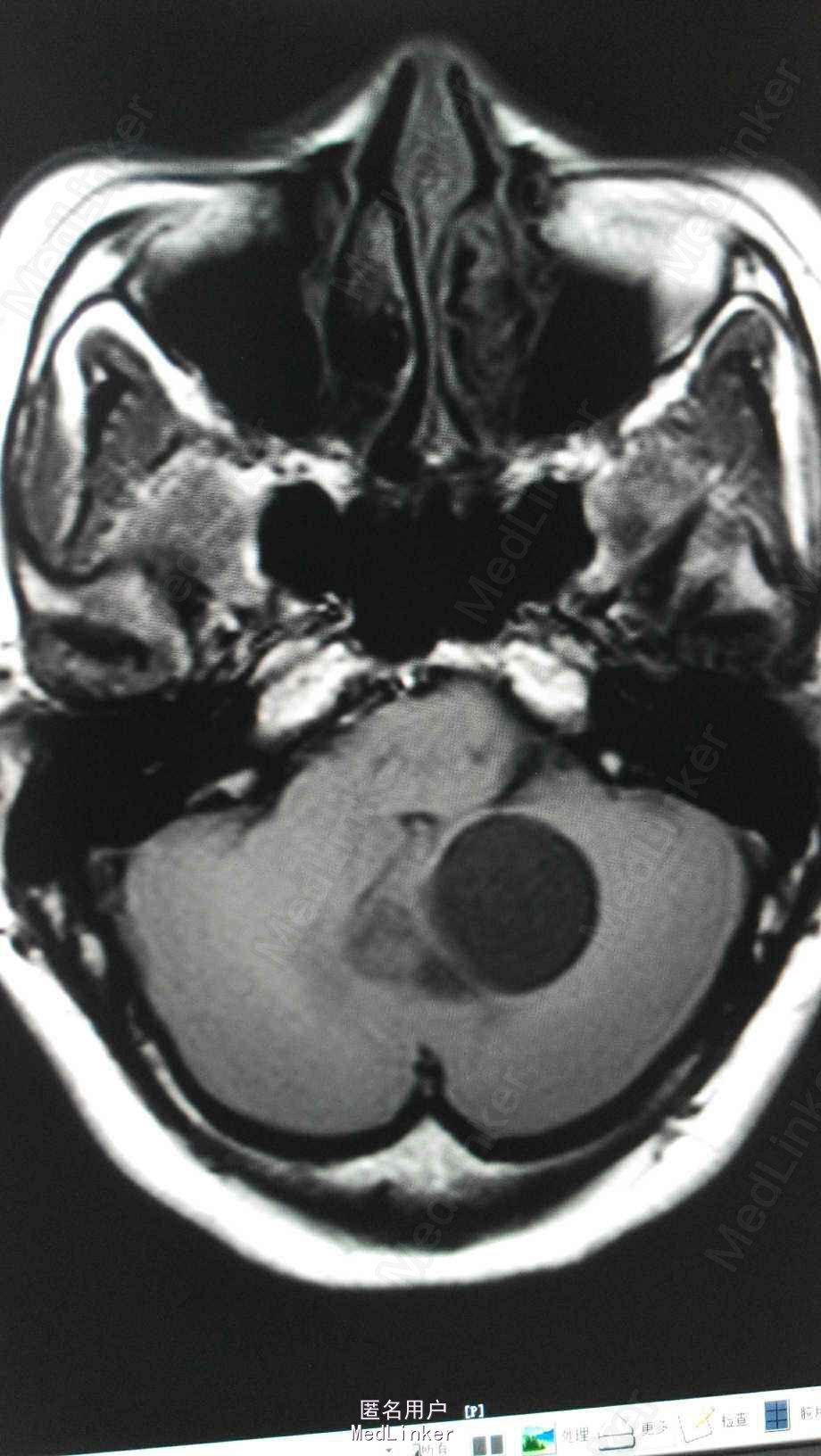 头颅MRA:小脑蚓部占位,血管母细胞溜可能性大;左椎动脉颅内段局部轻度狭窄;左侧大脑前动脉A1段稍细。