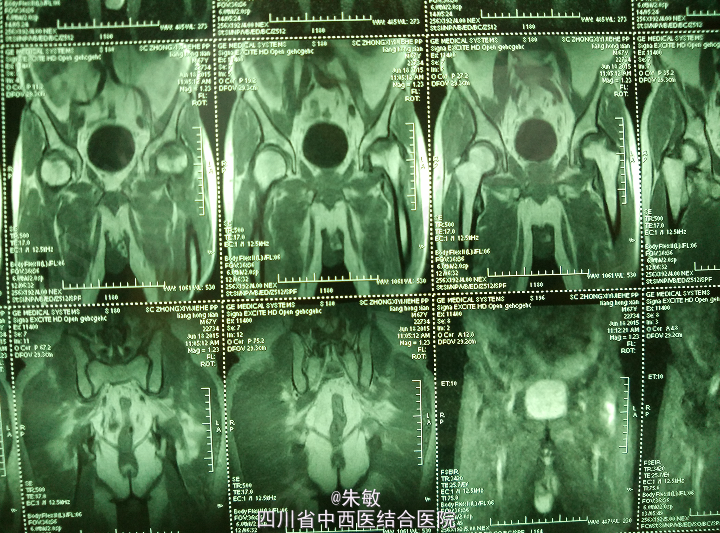 麻木,无恶寒发热,无胸闷胸痛,无心慌心悸,无恶心呕吐等,经休息无明显好转。除当患肢小腿悬于床边或患肢接近于屈膝屈髋90°时不感疼痛外,余时均感疼痛,活动及翻身时尤甚。以上症状持续存在,呈进行性加重,一直未予诊治。1月前因痛无法行走,于今日来我院就诊,行MRI检查后门诊以"双侧股骨头坏死"收入我科。入院症见:轮椅推入,神志清楚,诉左髋部疼痛,不敢行走,无腰痛,无双下肢麻木,无恶寒发热,无胸闷