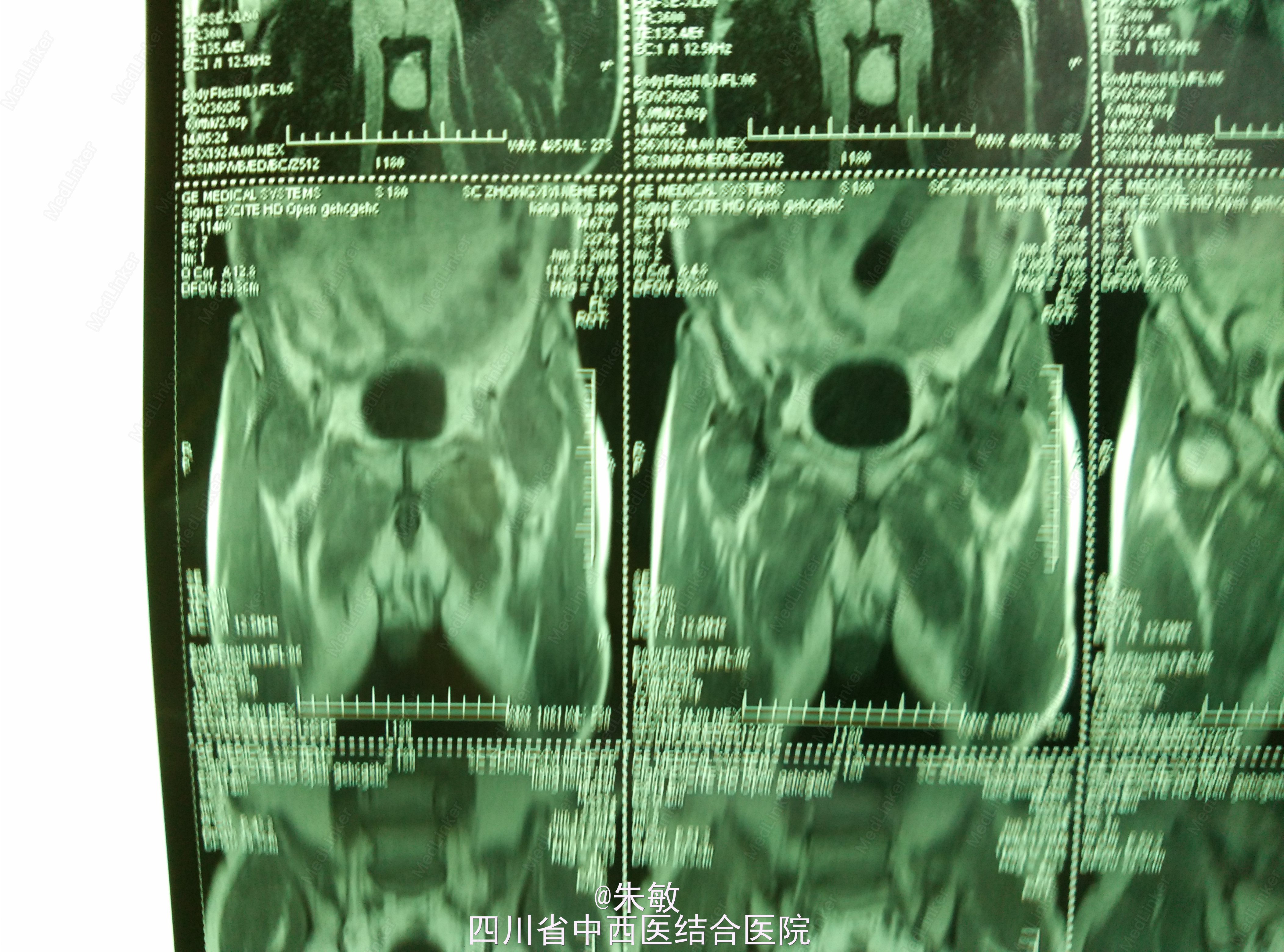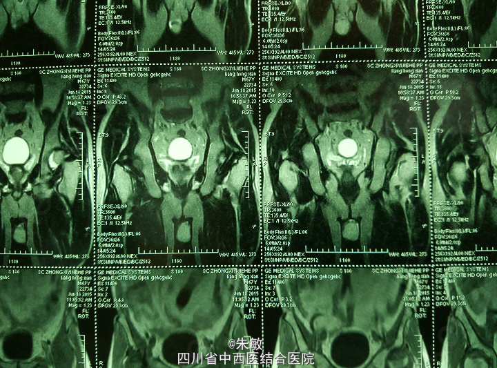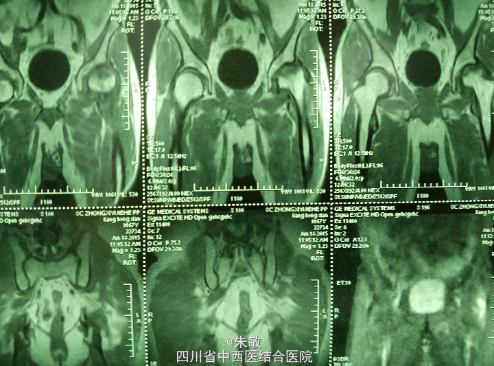 4.本院MRI:左髋关节间隙稍窄,两侧股骨头关节面下斑片、条状异常信号,两侧髋关节囊积液,以左侧明显。关节周围软组织层次清楚,考虑双侧股骨头无菌坏死。