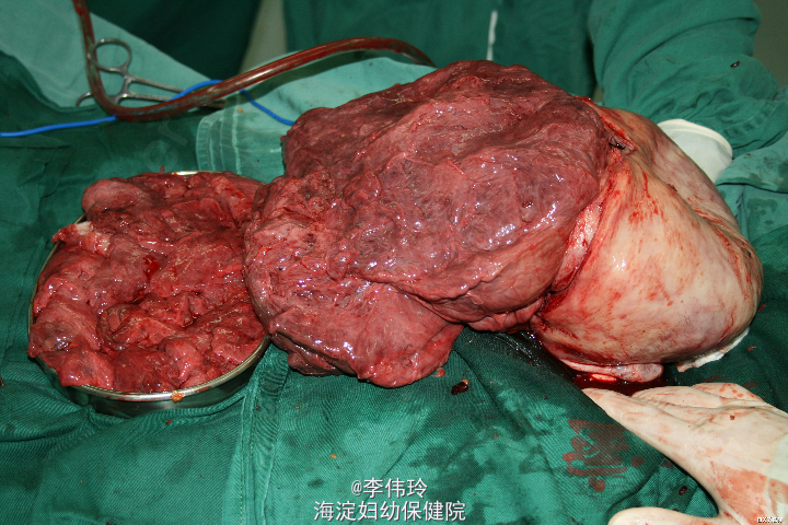 子宫肌瘤有玻璃样变,肉瘤样变等,但红色样变是孕期常发生的,本病例的确少见,不过李医生做的的肌瘤切除还是子宫全切呢?感觉图片像是子宫全切。