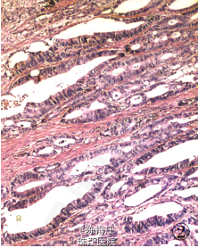 影像学检查:钼靶显示右乳腺浅分叶状高密度影,边界尚清,无钙化及毛刺征;CT 平扫盆腔类圆形实性肿块影,边界清晰,瘤体内见不定形钙化,结肠部分肠腔狭窄,肠壁增厚;遂行结肠镜检查示乙状结肠可见肿物,覆脓苔,质脆。血清中CEA 70.23 ug/ ml、CA125422.15 KU/ L,CA199 137.53 U/ml。