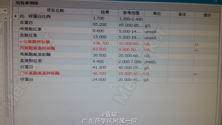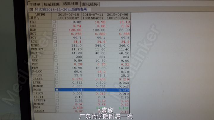 辅助检查:多次血常规检查见嗜酸性粒细胞计数及比例增高(见附图),肝功能检查异常(见附图),超敏C反应蛋白6.200mg/L,降钙素原0.076ng/ml,余大、小便常规正常,多次大便找虫卵阴性,肾功能、凝血功能、血脂均正常,肿瘤指标(AFP、CEA、Ca-199、CA-125、CA-724、CA-153)均正常,胃镜检查示非萎缩性胃炎轻度,多点活检未见明显嗜酸性粒细胞浸润。腹部MR+MRCP:肝内多发异常信号影,考虑感染性病变,注意寄生虫感染可能,MRCP未见异常。