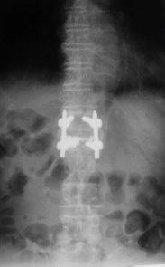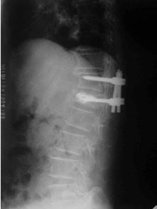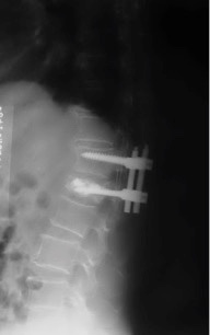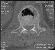 治疗:因患者椎体压缩骨折明显,椎体后缘骨折不完整,突入椎管,且硬膜囊受压,因此不适合行椎体成形术。给予单节段椎弓根钉固定并椎板切除减压术。骨折椎置钉结合钉道骨水泥加强稳定性。术后随访效果满意。