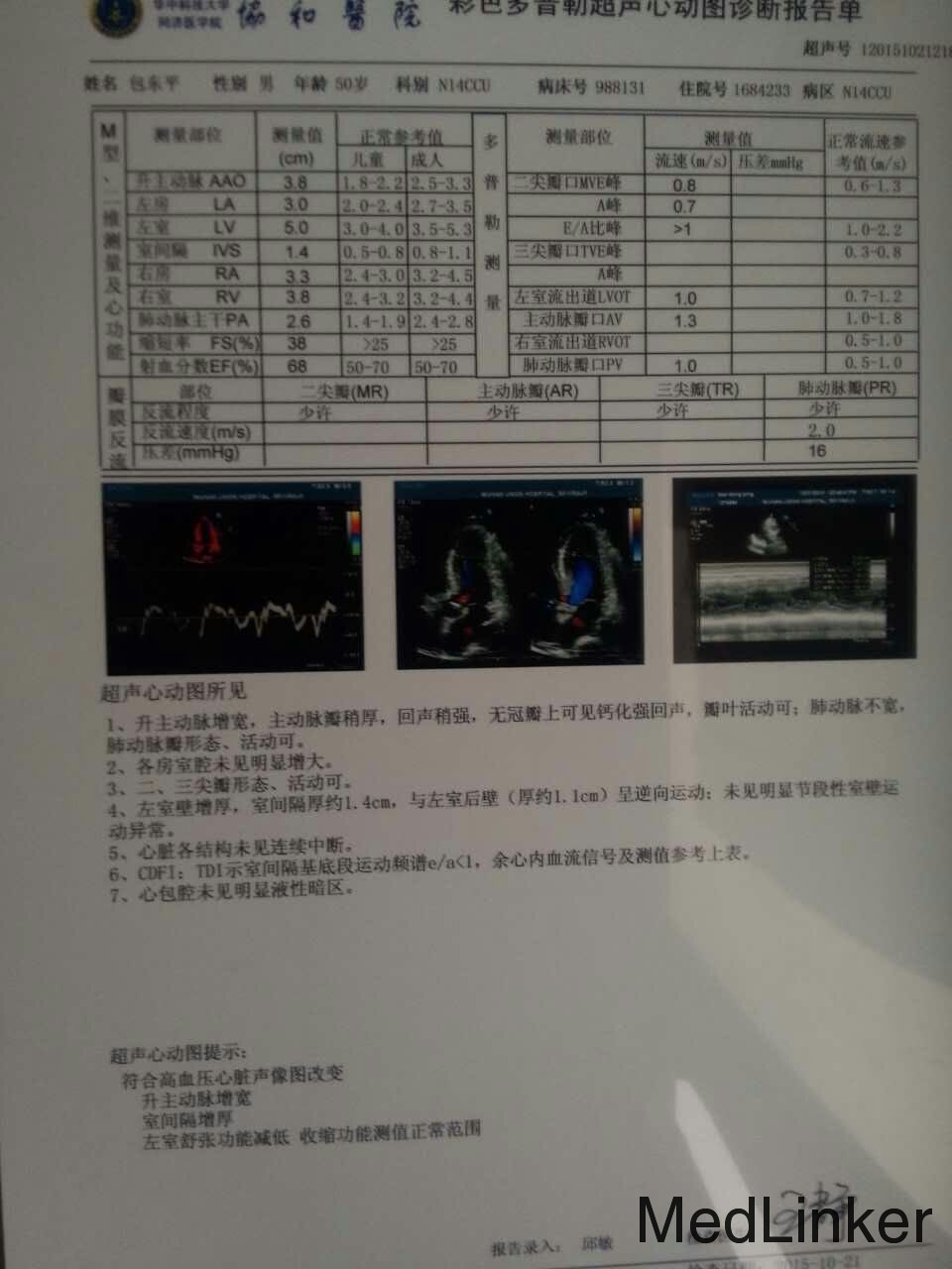 辅查:急诊TNI45084pg/ml,CK-MB47.9ng/ml。超声心动图示:符合高血压心脏声响图改变,升主动脉增宽,室间隔增厚,左室舒张功能减低。心电图示:窦性心律,电轴左偏,急性前间壁心梗下壁Q波。