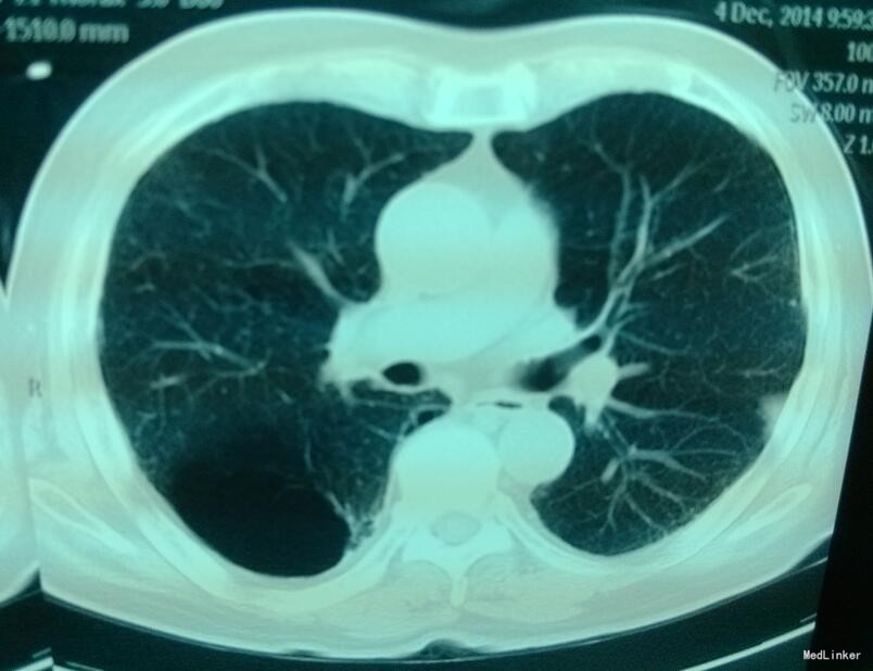 诊断为:1、右上肺肺大泡,2、COPD。患者经内科保守治疗后稍好转,遂继续观察。