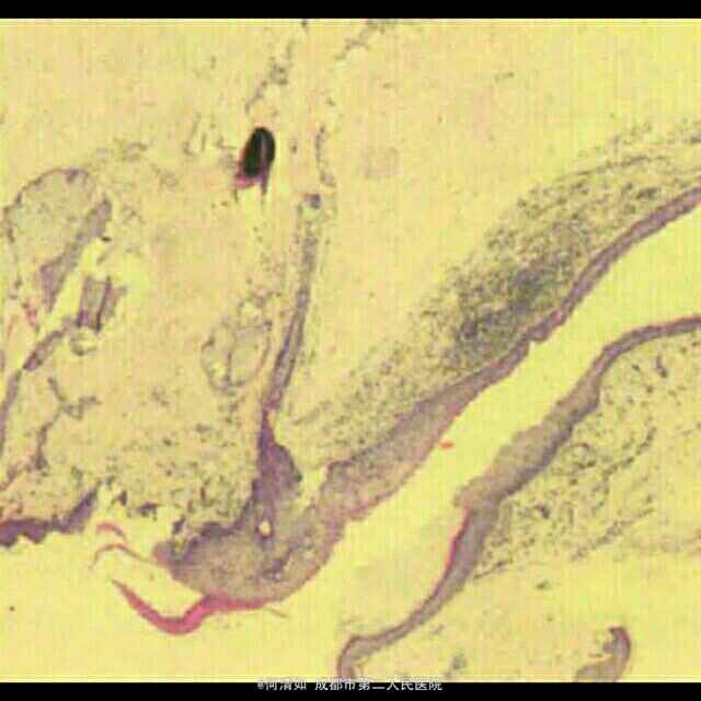讨论:皮肤纤毛囊肿是一种少见的良性皮肤损害,好发于生育年龄女性的下肢部位,囊肿直径通常数厘米,可为单房性或多房性,充满清澈或琥珀色液体;囊肿位于真皮内,囊壁由单层立方形或柱状纤毛上皮所组成。