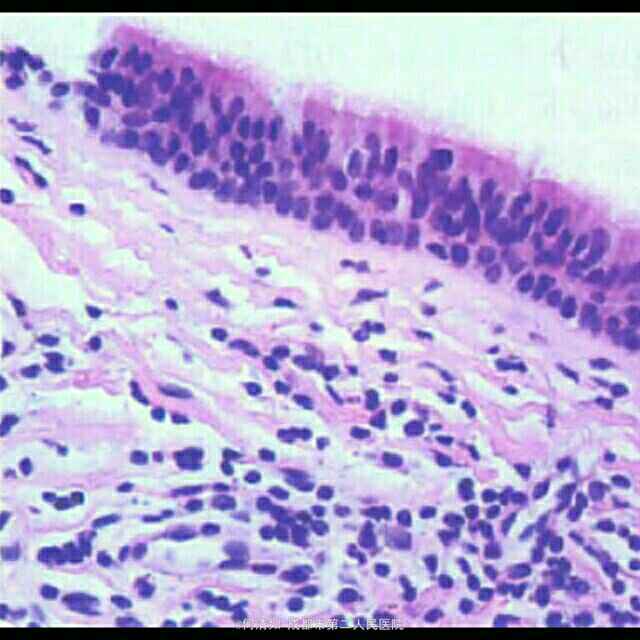 病理检查:真皮可见一囊状腔隙直接开口于表皮,囊壁被覆假复层柱状上皮细胞,周围伴较多淋巴细胞浸润。