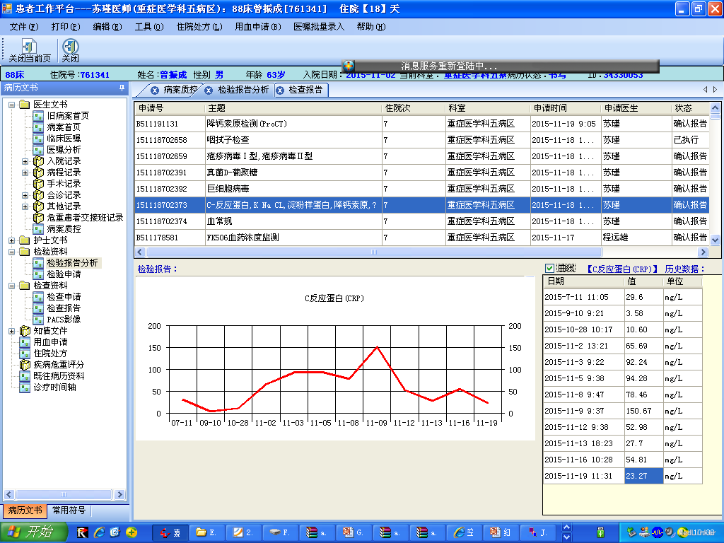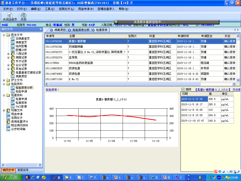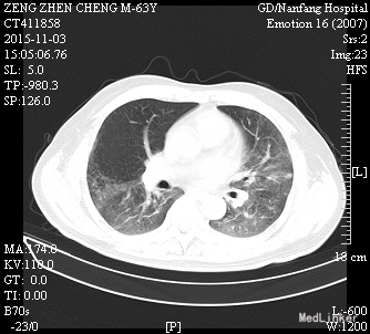 入院前患者于2015年8月29日因慢性肾功能不全尿毒症期在我院行同种异体肾移植术,术后移植肾功能恢复顺利,予“普乐可复+米芙+美卓乐”抗排斥治疗,尿量基本维持在3000ml/日。1周前无明显诱因出现咳嗽,偶伴发热,无咳痰,无乏力、恶心、呕吐、少尿等症状。11-02上午至我院门诊就诊,检查发现患者感染指标升高,考虑为“肺部感染”。患者为求进一步诊治入住我院,门诊以“肺部感染”收入我科