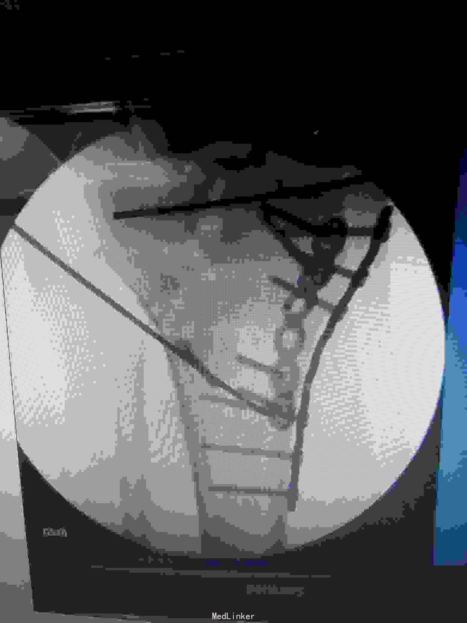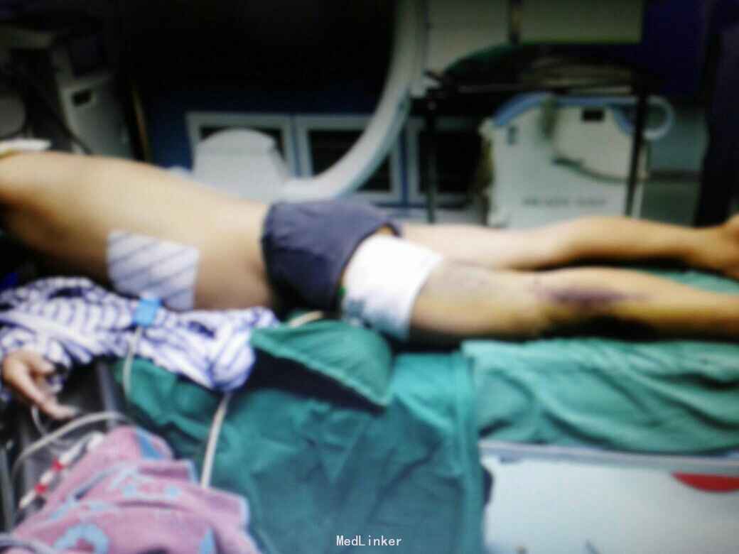 讨论:内外侧胫骨平台骨折,正常情况下只需在仰卧位下分别行内侧及前外侧入路进行内外侧柱的固定,但是如果骨折累计后内侧骨块,单纯内侧钢板固定仍无法稳定骨折端,这时候需要后内侧钢板的固定,仰卧位下无法清楚显露后内侧骨块,并进行固定,我们采用俯漂体位进行复位固定,俯卧下行后内侧入路,可以清楚显露后内侧及内侧骨块,同时可方便进行固定。