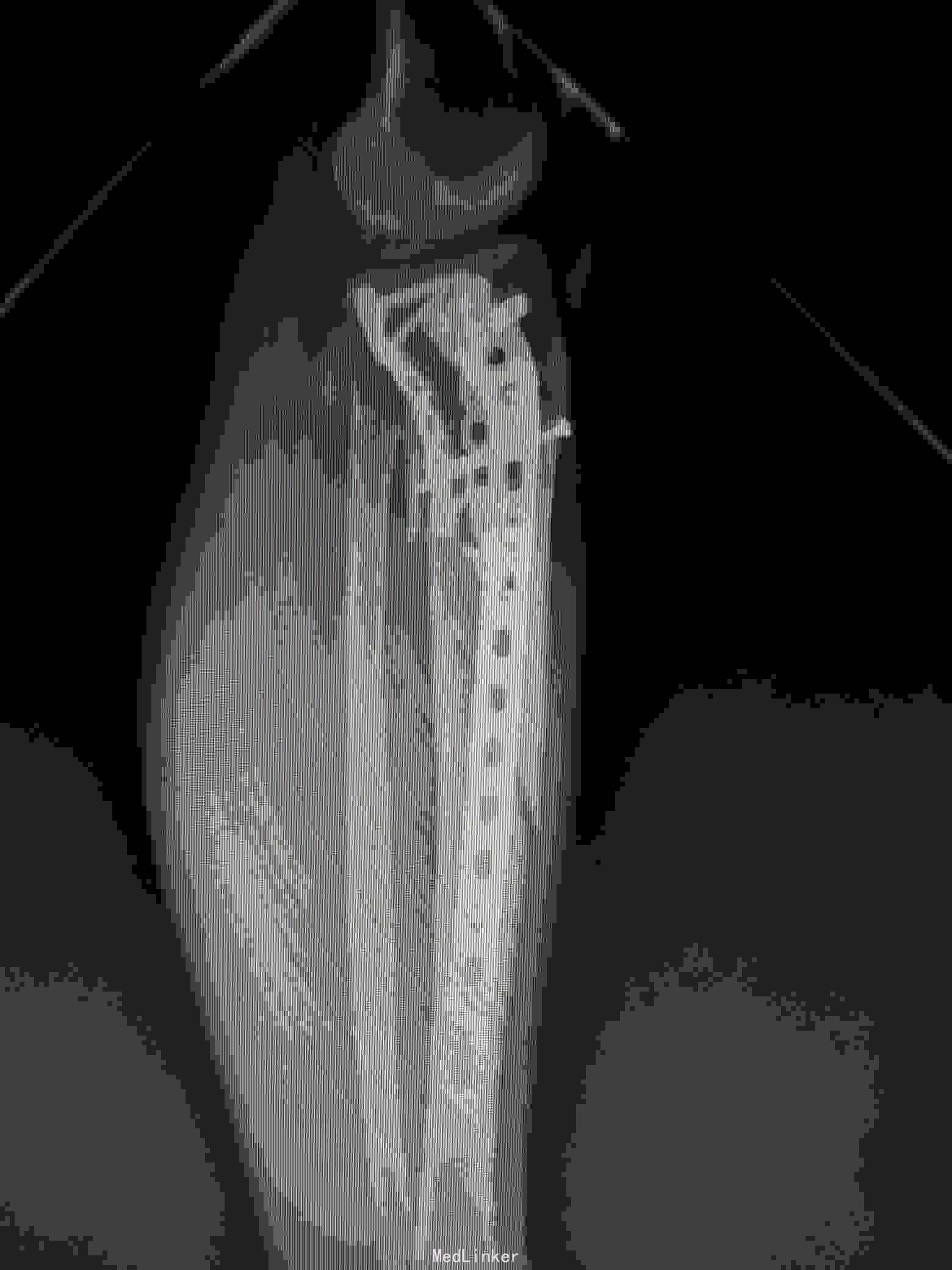 术后复查X线片提示:骨折端对位对线好,力线平。