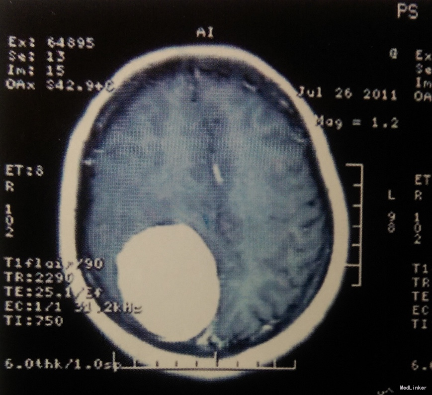 术前影像学检查:颅脑CT及MRI扫描示:右侧额顶部占位,强化效应明显,边界清,考虑脑膜瘤可能。