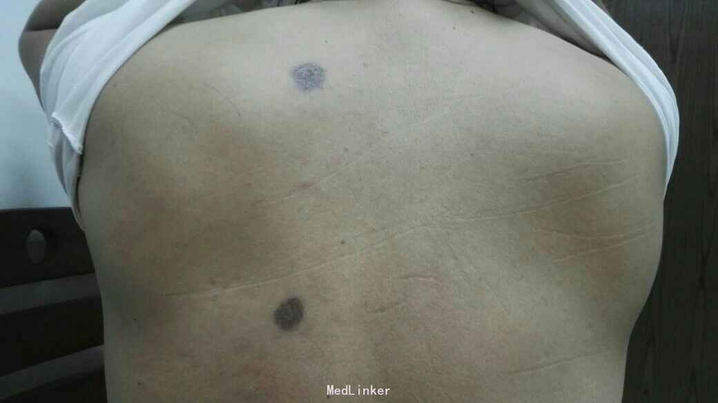 图1 患者皮损;图2 皮肤镜检查
