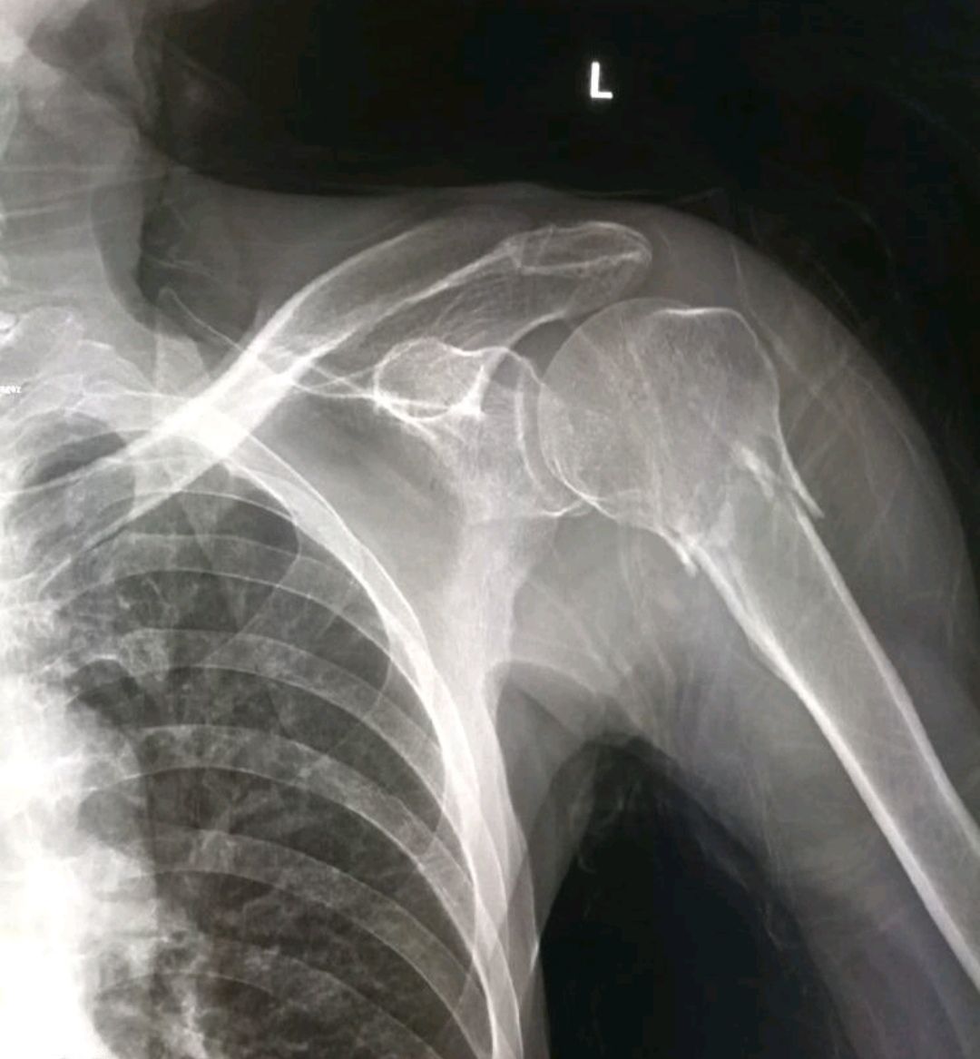 患者于4小时前在地边干活时发生晕厥,从约1米高的塄坎上摔下,左侧身倒地,倒地后即感左侧肩关节,左侧肩关节活动受限。伤后未行特殊处理,用出租车急送我院就诊。门诊拍片后以“左肱骨外科颈骨折”之诊断收住院。