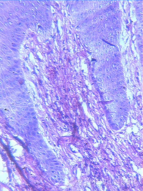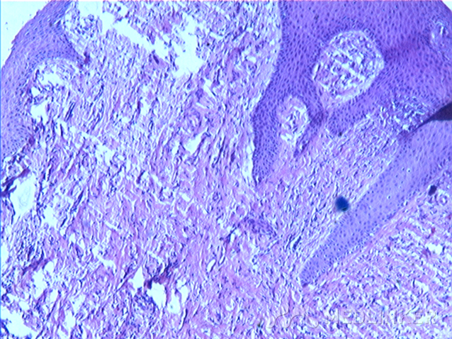 组织病理:角化过度,表皮增生,真皮乳头可见胶原增生与表皮排列垂直分布,真皮浅层血管周围少量炎细胞浸润。