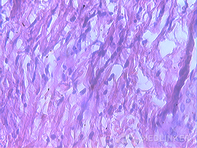 讨论:获得性甲周纤维角化瘤临床表现,一般肿物长轴与侧甲沟走行一致,顶部角化,质硬,损害下甲板形成纵行凹陷.组织病理学活检提示:表皮角化过度,棘层肥厚,真皮可见大量增生的胶原纤维及成纤维细胞,增生胶原排列与表皮垂直分布。获得性甲周纤维角化瘤根据特征性临床表现及组织病理易被诊断,治疗以保留甲母质的外科手术切除为佳。需要与结节性硬化的甲周纤维瘤相区别。