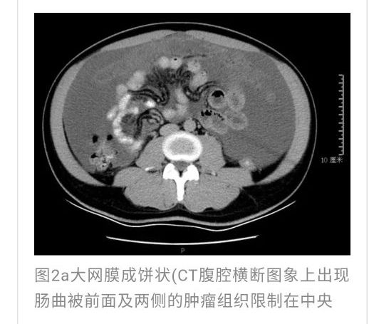 查体:腹部膨隆,移动性浊音阳性,触诊全腹韧,腹膜下可触及板状肿块,成饼状,位于脐周,大小约5cm,稍硬,活动度可,全腹轻压痛,无反跳痛。血液实验室检查:白细胞7.1×10-9/L,中性粒细胞百分比0.735,C反应蛋白(CRP):64.4mg/L,血沉87mm/h,白蛋白30.7g/L,降钙素原0.88ug/L。肿瘤标志物:CEA 14.42ug/L,CA199:183.12U/mL,CA72-4 78.42U/mL。腹水肿瘤标志物:CEA>1000ug/L,CA199>1000U/mL,CA724 258.13U/mL。